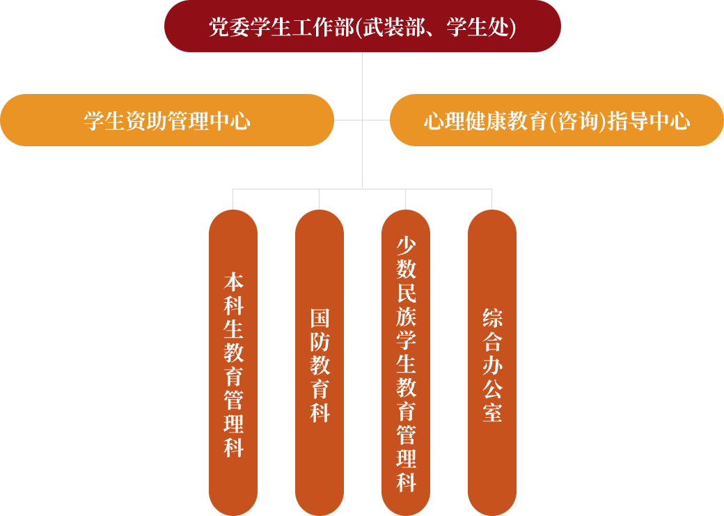 党委学生工作部(武装部、学生处)负责本科(含预科)生思想政治教育、日常管理、少数民族学生教育管理服务、辅导员队伍建设、学生安全稳定、国防教育等工作;统筹全校学生资助育人、学生心理健康教育工作;完成学校交办的其他工作。