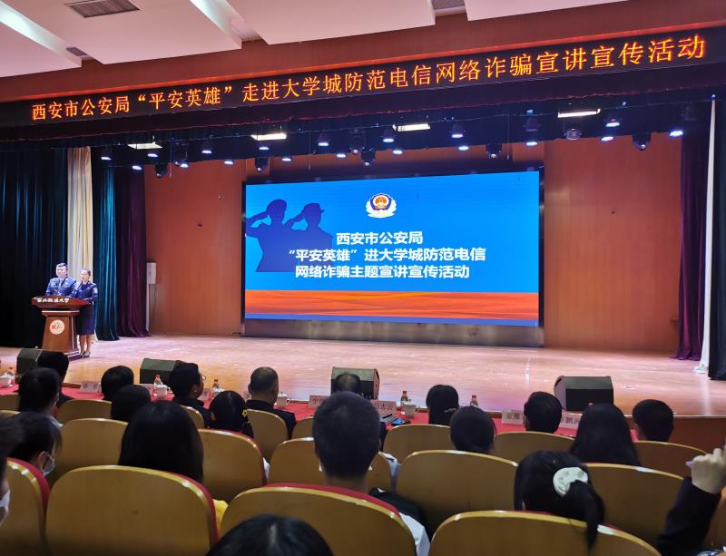 活动中,全国月度“平安英雄”公安灞桥分局巡特警大队副大队长王排、公安鄠邑分局扫黑办副主任刘晓军、公安局碑林分局长安路派出所民警王安坤、蓝田县公安局文姬路派出所所长胡森荣分享了公安人员在党和人民最需要的时候,奋不顾身、冲锋在前、打击犯罪、维护治安的赤胆忠诚和感人故事,介绍了目前电信网络诈骗的惯用手段和具体防范措施,并为同学们带来了由民警自编自导自演,以防范电信网络诈骗为主题的快板、相声和歌曲等精彩节目。