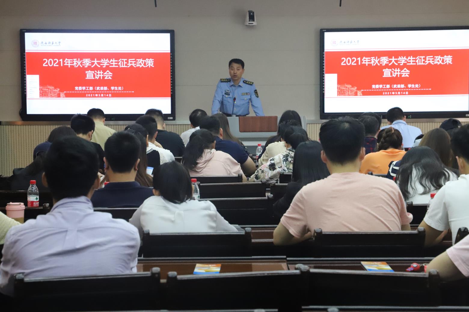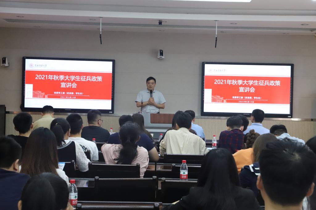 为加强秋季大学生征兵宣传工作,激发大学生参军热情,持续营造参军报国氛围,5月14日下午我校在格物楼3201报告厅举办2021年秋季大学生征兵政策宣讲会,雁塔区武装部政委常海波一行3人来我校进行宣讲,全校各学院本科生专、兼职辅导员以及部分主管学生工作的处级干部参加了宣讲会,党委学工部(武装部、学生处)副部(处)长祁斌业主持会议。