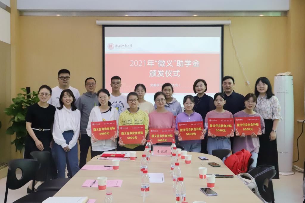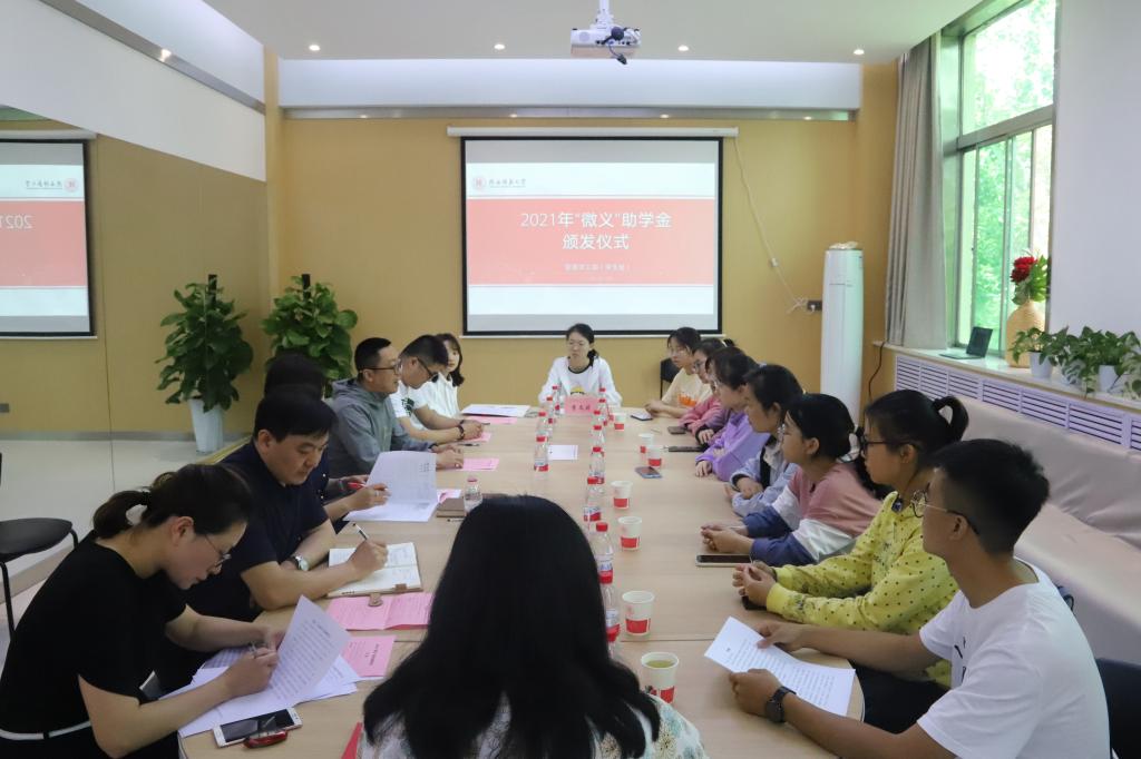 5月18日中午,2021年“微义”助学金颁发仪式在雁塔校区学生处会议室召开。广州视源电子科技股份有限公司高级副总裁孙毅拯、员工朱磊,党委学工部(学生处)部(处)长蒋毓新、副部(处)长祁斌业,学生资助管理中心、校友总会办公室(教育基金会秘书处)有关干部及全体受助学生参加颁发仪式,仪式由祁斌业主持。