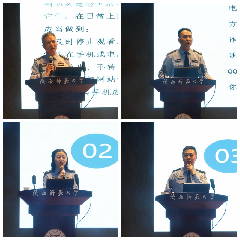 活动中,郭杜派出所副所长蒲晓军结合不同种类诈骗的具体案例,剖析了“电信诈骗”“网络诈骗”“街头诈骗”的主要形式和常见作案手法,强调了“十个凡是”“三不一及时”的重要性;民警宁书琪播放了反诈中心《不要被骗》宣传片,以青年人喜闻乐见的形式感染与会同学,并针对防范盗窃介绍了具体措施;民警李晨山通过宣讲防止恐怖主义渗透的识别和应对方法,结合自身出国经历,强调了我国社会主义制度的优越性,号召同学们坚定理想信念,厚植爱党爱国情怀。