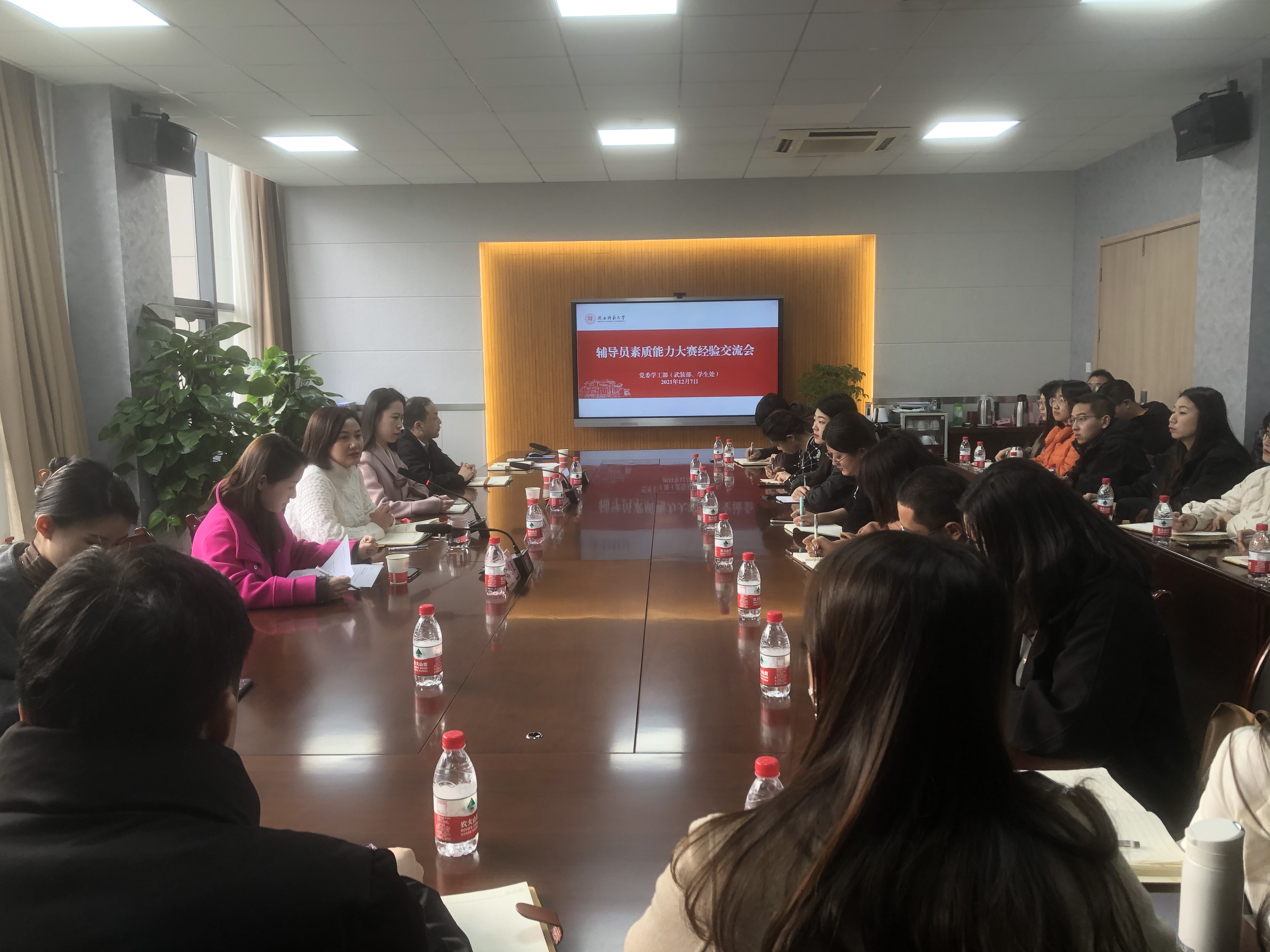 在第八届陕西高校辅导员素质能力大赛获奖的辅导员张思豆和秦泽华分享了比赛的心路历程及备赛经验,与会人员围绕职业素质能力提升进行了广泛交流。集体学习了2021年“最美高校辅导员”的先进事迹,观看了“闪亮的名字—2021最美高校辅导员最美大学生”发布仪式回播视频,并结合工作实际就如何补齐发展短板、突破“发展瓶颈”进行了交流发言。
