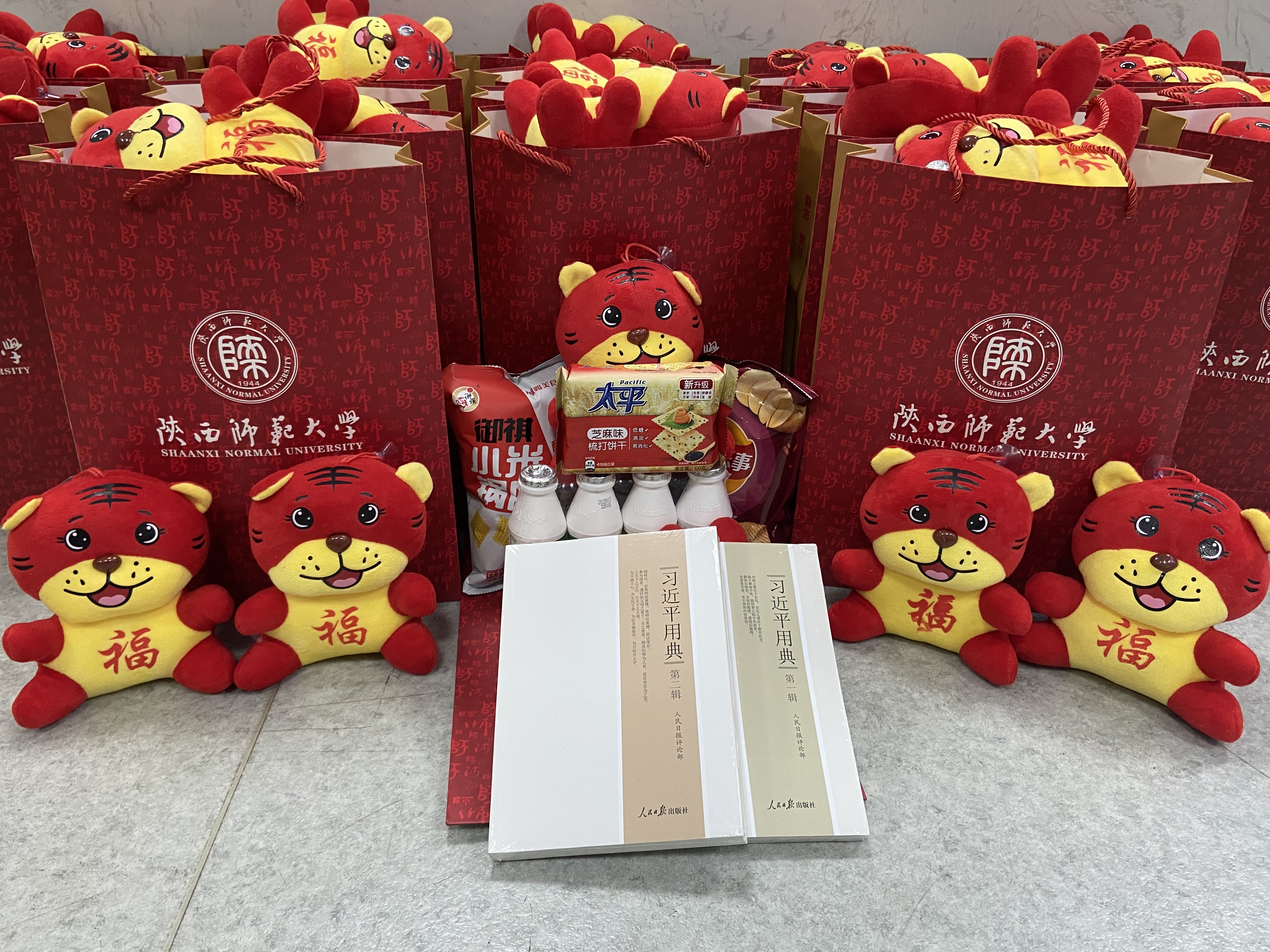 春节前夕,学校为留校本科生购置了新春大礼包,包括零食、饮品、春联、福字、一只萌萌的“虎宝宝”以及全套书籍《习近平用典》,希望同学们在校期间的物质需求得到满足,同时通过丰富的“精神食粮”持续充电,充分汲取习近平总书记的学习智慧以启迪自我,与“假期限定”室友一同贴福字和春联,营造浓郁的新春气氛。1月30日上午,党委学工部(学生处)副部(处)长王党及学生资助管理中心有关干部前往学生宿舍为同学们发放新春大礼包并送上新年问候和祝福。“慰问礼包内容满满,我深切感受到学校对留校学生无微不至、细节满满的关爱。”留校学生、食品工程与营养科学学院尚鹏飞说。