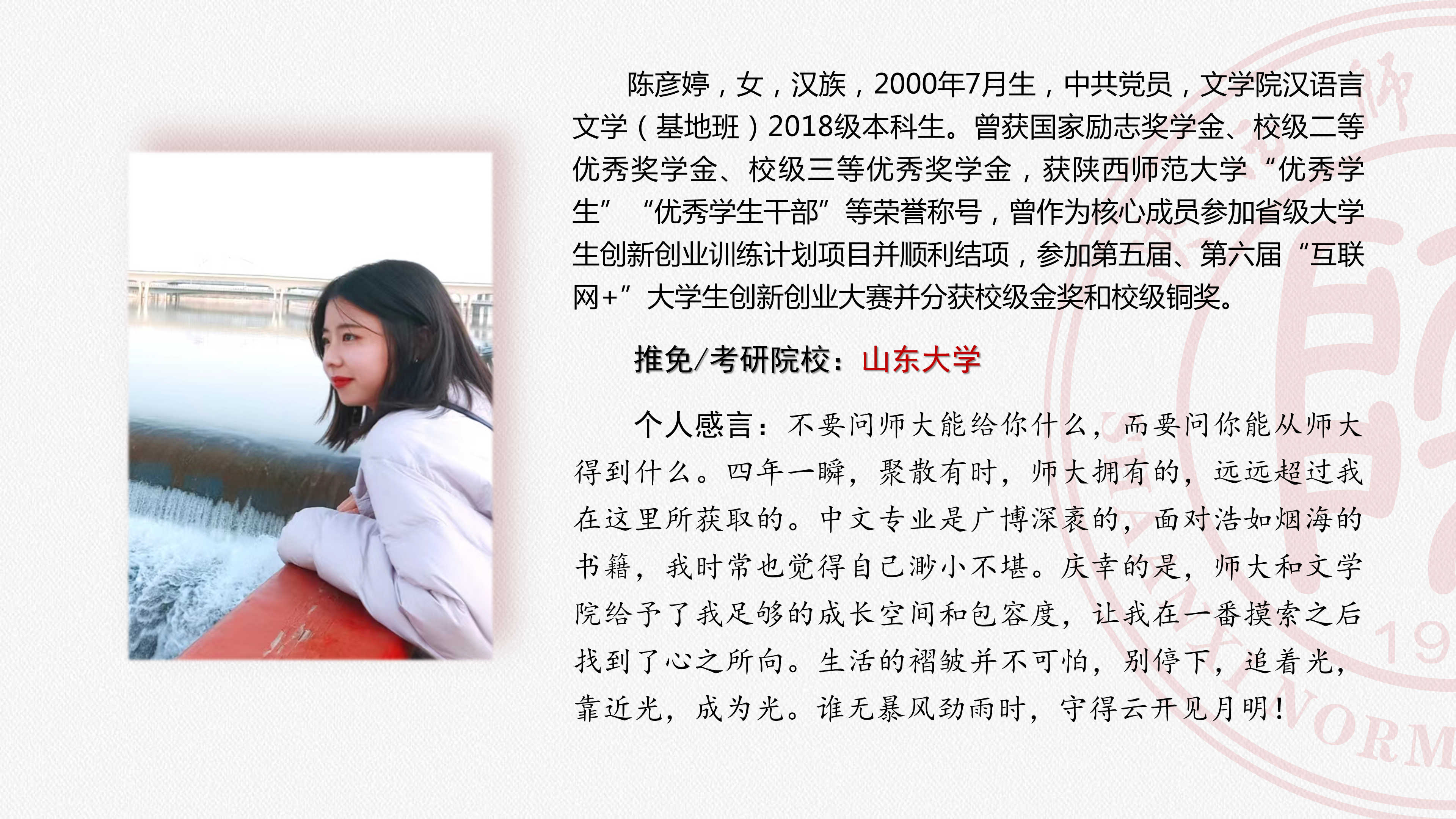 聚是一团火,散是满天星。陕西师范大学2018级受助毕业生们将铭记“西部红烛两代师表”精神,不忘初心、肩负重任,自觉将个人成长发展融入国家发展大势,怀揣坚定理想信念奔赴全国各地,在不同领域发光发热。祝愿2018级全体毕业生前程似锦、星光璀璨!