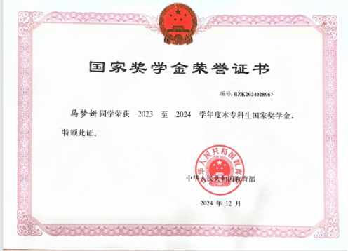 马梦妍始终将专业学习放在首位,大一至大三专业课成绩稳居年级前列(2/248、3/248、1/248),大三学年学业成绩、综合测评双第一的优异成绩荣获2023-2024年度国家奖学金,并多次获得陕西师范大学一等优秀奖学金、三等奖学金及“红烛师范生”荣誉称号。她注重综合素质提升,综合测评成绩位列班级前30%(1/21、4/21),展现了全面发展的优秀素养。