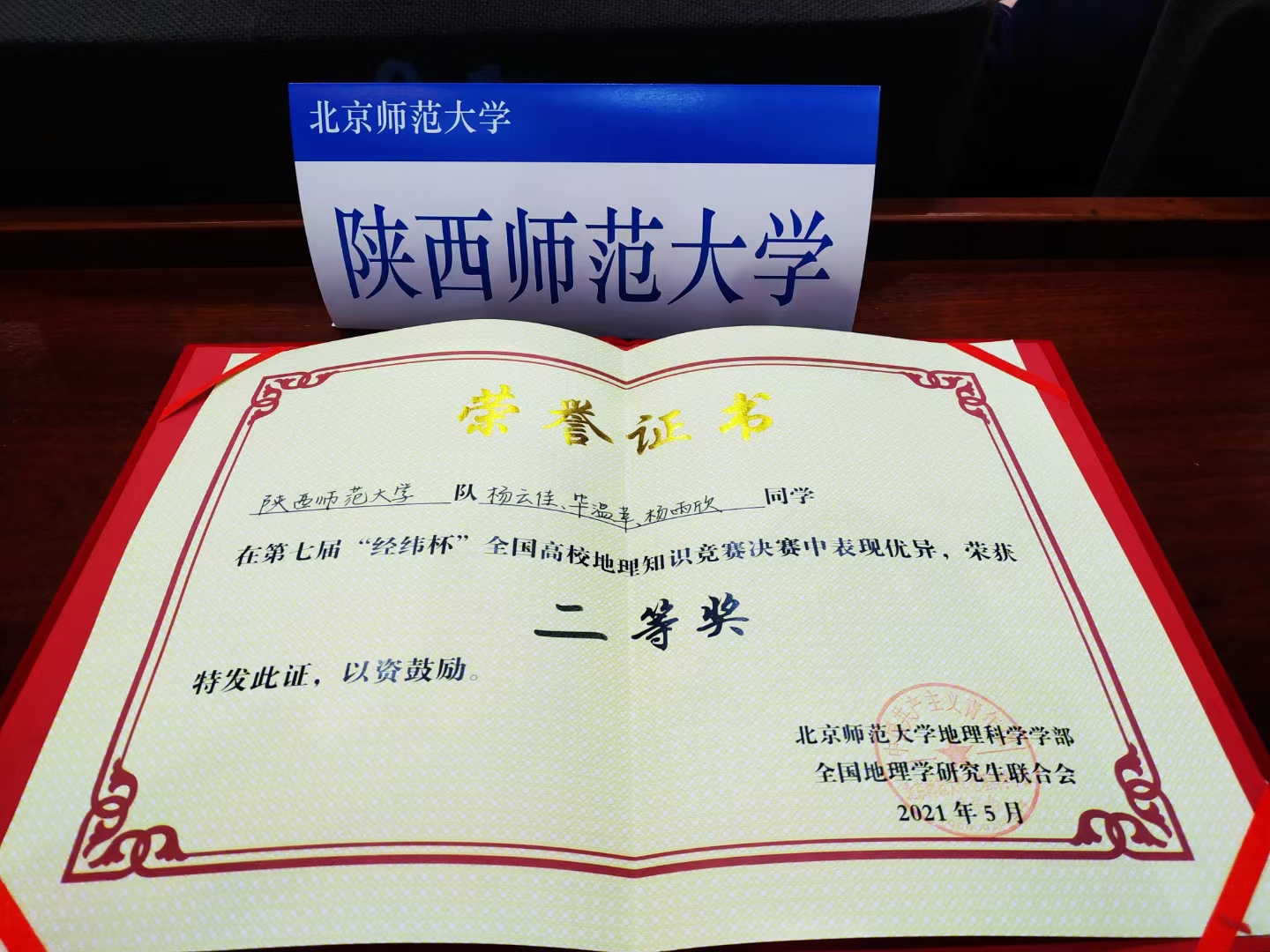5月15日,由北京师范大学和全国地理学研究生联合会共同举办的全国第七届“经纬杯”高校地理知识竞赛决赛在北京师范大学拉开帷幕,我校地理科学与旅游学院严建武老师指导的,由2018级地理科学创新班杨云佳、毕温莘、2019级地理科学杨雨欣等3名同学组成的代表队获得二等奖。