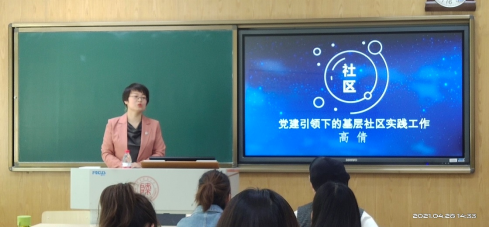 高倩书记以习近平总书记关于社区工作的重要论述导入,讲解了社区工作的重要意义、主要内容及社区的组织架构。她结合自身多年的社区工作经历,讲述了社区党组织开展的丰富多彩的党建活动,分享了新冠肺炎疫情防控中基层党组织的战斗堡垒作用以及社区干部、小区物业人员的辛酸与坚韧。此外,高倩书记还基于自身成长经历,与同学们分享了学习和工作的经验,勉励同学们在正确的年龄做正确的事,莫要辜负大好年华。