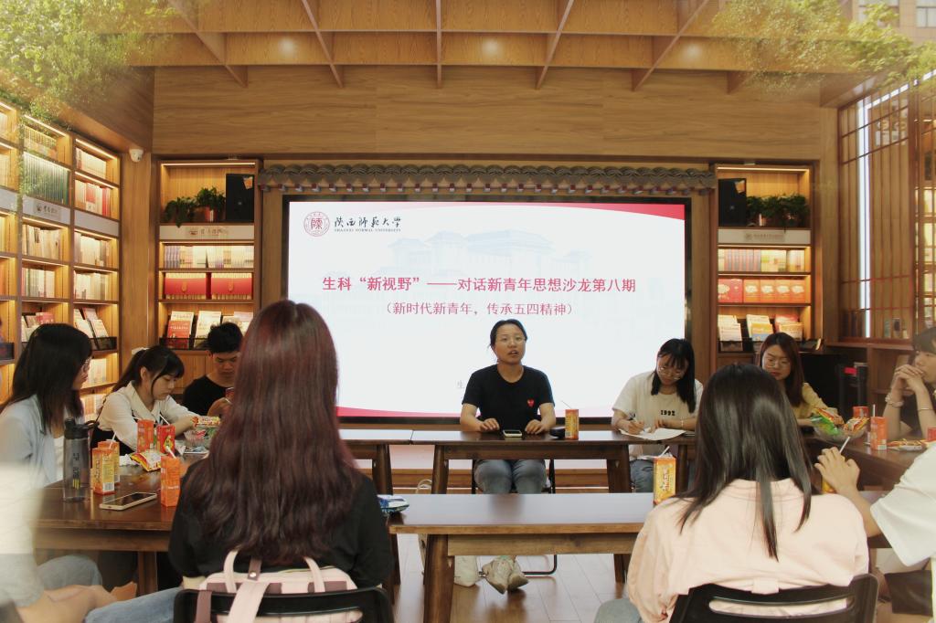 为引导青年学生深入学习贯彻五四精神,涵养家国情怀,以实现中华民族伟大复兴为己任,砥砺爱国之志、强国之志,践爱国之行。生命科学学院于5月12日下午在长安校区首阳书坊,开展主题为“新时代新青年,传承五四精神”的第八期生科新视野·对话新青年思想沙龙。本次沙龙邀请到我校马克思主义学院同学一起分享交流,同学们共同学习分享百年来的优秀青年事迹,了解他们为中国共产党的发展做出了哪些卓越贡献,探讨他们的事迹为何如此打动人心,表达作为新时代青年要如何传承五四精神。本次会议由生命科学学院2018级本科生段红霞同学主持。