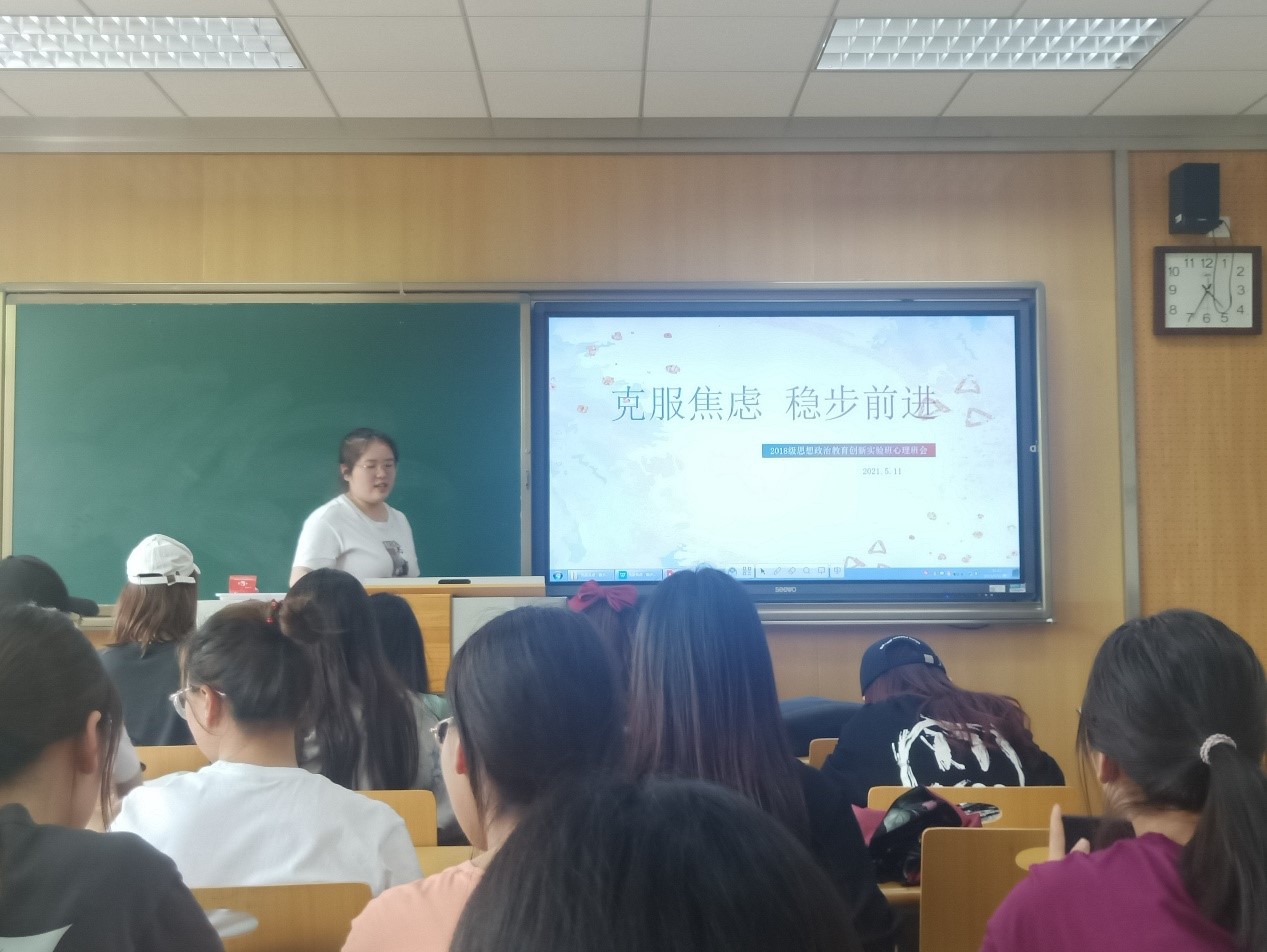 为了解同学们的心理状况,帮助大家正确面对焦虑、缓解升学压力,马克思主义学院2018级思想政治教育(创新实验班)于2021年5月11日下午顺利召开了“克服焦虑,稳步前进”主题心理班会。班会由心理委员钱晓雯主持,2018级思想政治教育(创新实验班)全体同学参加。