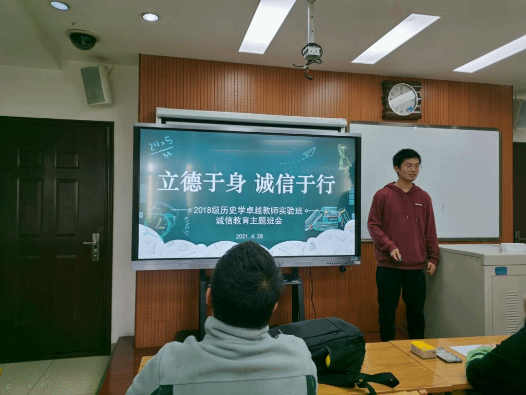 为落实学校关于举办“诚信教育活动月”活动的要求,进一步弘扬中华民族传统美德和社会主义核心价值观,引导学生讲诚信、树诚信、践诚信,创建优良学风,推动诚信校园建设,4月28日,历史文化学院2018级历史卓越教师班于文津楼1506召开了“立德于身,诚信于行”诚信教育主题班会,2018级本科生专职辅导员刘旭辉、兼职辅导员靳雅娜及历卓班全体同学参加了班会,此次班会由班长董玉虎主持。