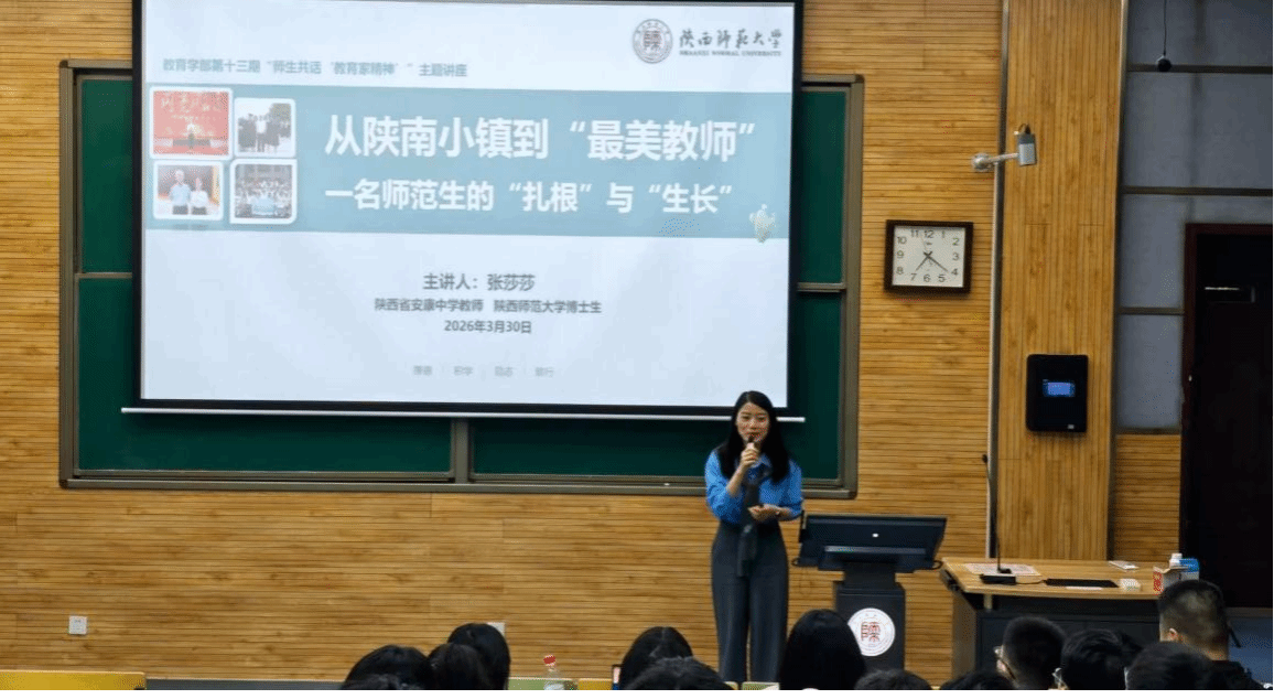 为深入学习践行教育家精神,充分发挥优秀校友的榜样引领作用,引导全校师生坚定教育理想、锤炼育人本领,教育学部博雅学风涵养工作室精心举办“师生共话‘教育家精神’”主题讲座。本次讲座特邀我校优秀校友、2021年“全国最美教师”张莎莎返校主讲,她与全校师生面对面倾心交流,分享自己从陕南小镇奔赴三尺讲台的成长历程,传递纯粹教育初心与奋进前行力量,现场氛围温暖而热烈。