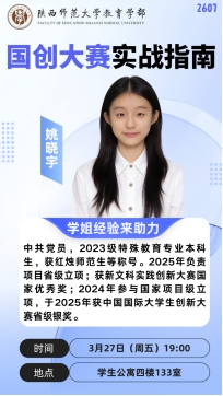 本次系列分享会紧扣大学生创新创业训练计划、“挑战杯”、中国国际大学生创新大赛等主流赛事,采用“赛事解析+经验分享+互动答疑”的形式,全方位覆盖学生参赛核心需求。3月27日的首场分享会,姚晓宇从比赛介绍、参赛经历、注意事项三个核心维度,系统解读了各类创新赛事的参赛要求、赛道设置及核心内容,并结合特殊教育专业特色,深入分析不同赛事的优势与挑战,给出了贴合专业实际的参赛建议。同时,她分享了自己从大一参与项目学习,到立足专业挖掘社会痛点、联动导师备赛的完整成长历程,为同学们提供了可借鉴的实践参考。