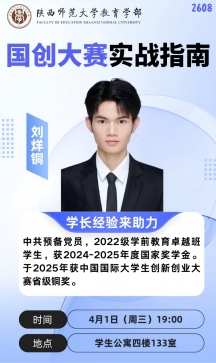 为进一步提升学生创新实践能力,助力学子精准把握各类创新赛事备赛要点,教育学部博雅学风涵养工作室开展“国创大赛实战指南”经验分享会。分享会分别于3月27日和4月1日开展,特邀学部优秀学子担任嘉宾,以朋辈引领的方式传递赛事实战经验,搭建高效实用的交流平台,切实推进学风建设走深走实。
