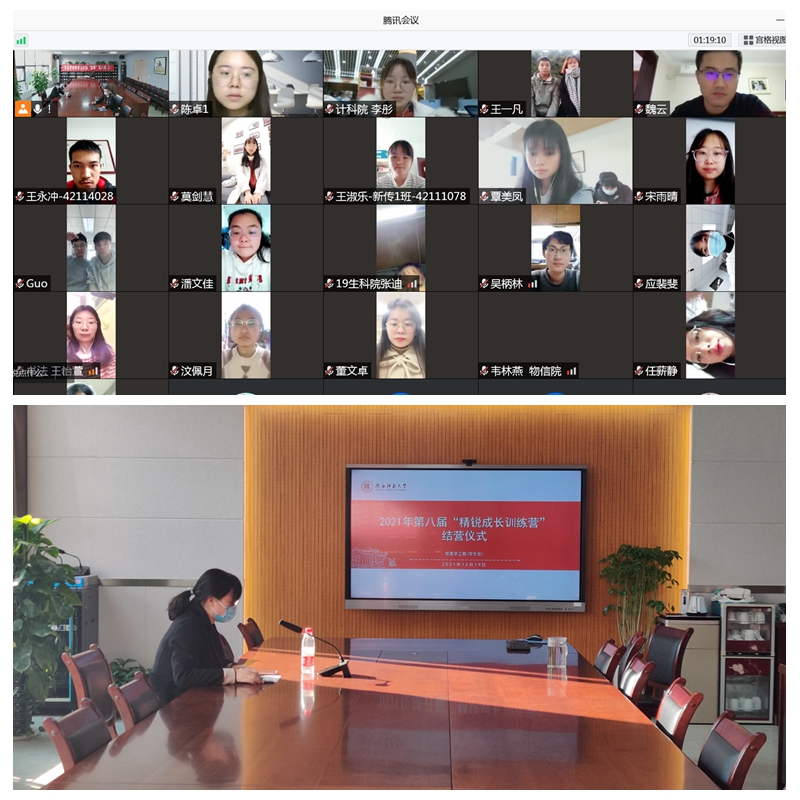 12月19日下午,第八届“精锐成长训练营”结营仪式在新勇活动中心东306室线上举行。党委学工部(学生处)学生资助管理中心老师、训练营指导教师及200余名参训学员参加了结营仪式。仪式由演讲口才训练营学员代表主持。