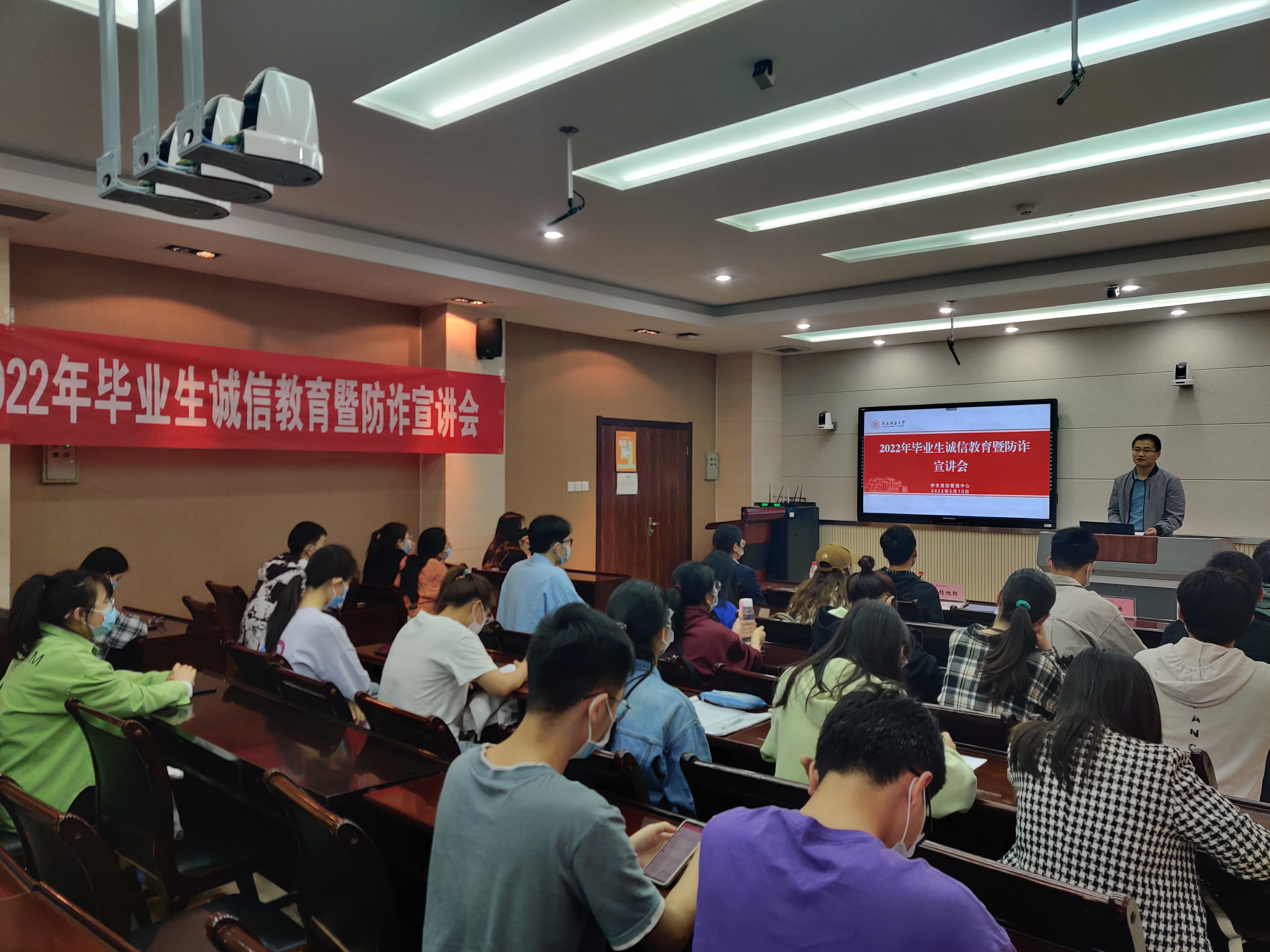 5月10日下午,2022年毕业生诚信教育暨防诈宣讲会在长安校区格物楼报告厅召开,我校党委保卫部正科级政保秘书杨旭朗、中国银行师大路支行客户经理李阳受邀作专题讲座,学生资助管理中心工作人员、各院部资助专干和近三百名学生线上线下参加了讲座。
