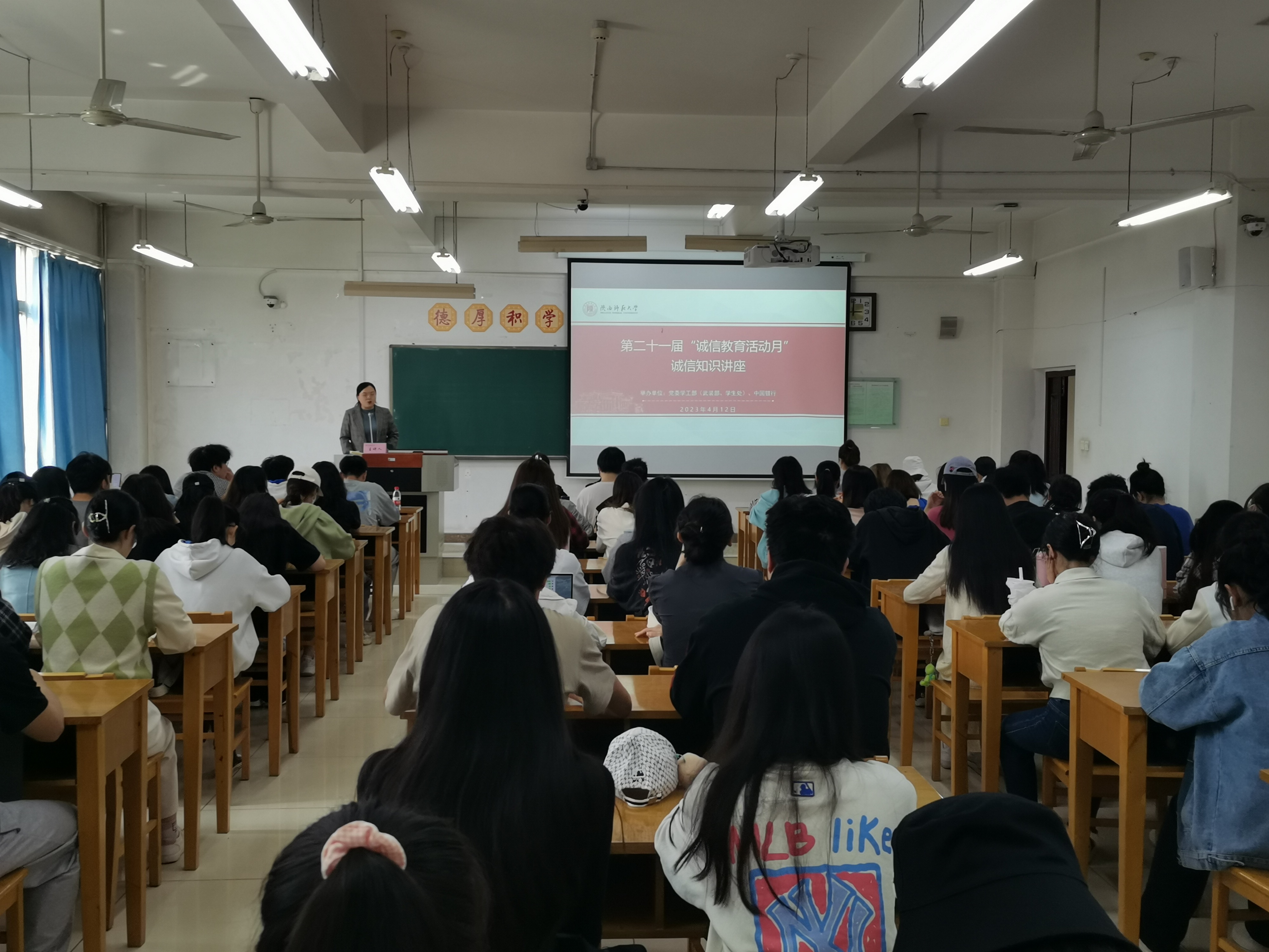 4月12日下午,我校第二十一届“诚信教育活动月”诚信知识讲座在文津楼1408教室举行,雁塔分局“红雁”反诈宣讲团警官郭梦雨、中国银行师大路支行客户经理李阳受邀做专题讲座,学生代表100余人参加活动。