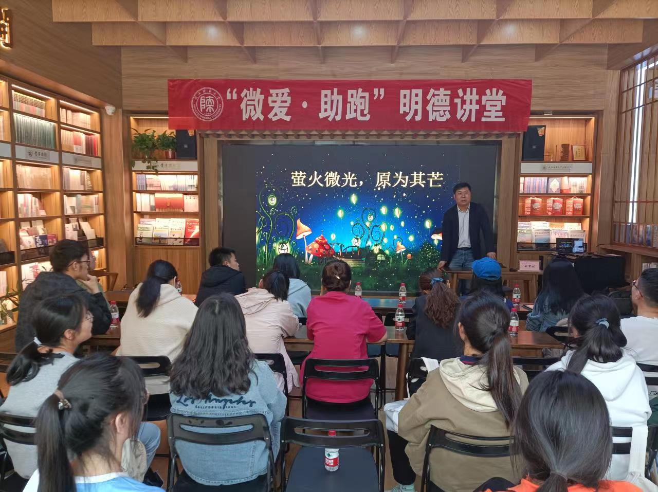 4月26日下午,我校第四期“微爱·助跑”明德讲堂在长安校区新勇活动中心首阳书坊举行,我校校友、陕西师范大学附属中学高三语文备课组组长、陕西省教学能手、西安市骨干教师、陕西省“国培计划”授课专家田甲林老师应邀作了题为“萤火微光 原为其芒”的主题讲座,学生资助管理中心工作人员及30名学生参加讲座。