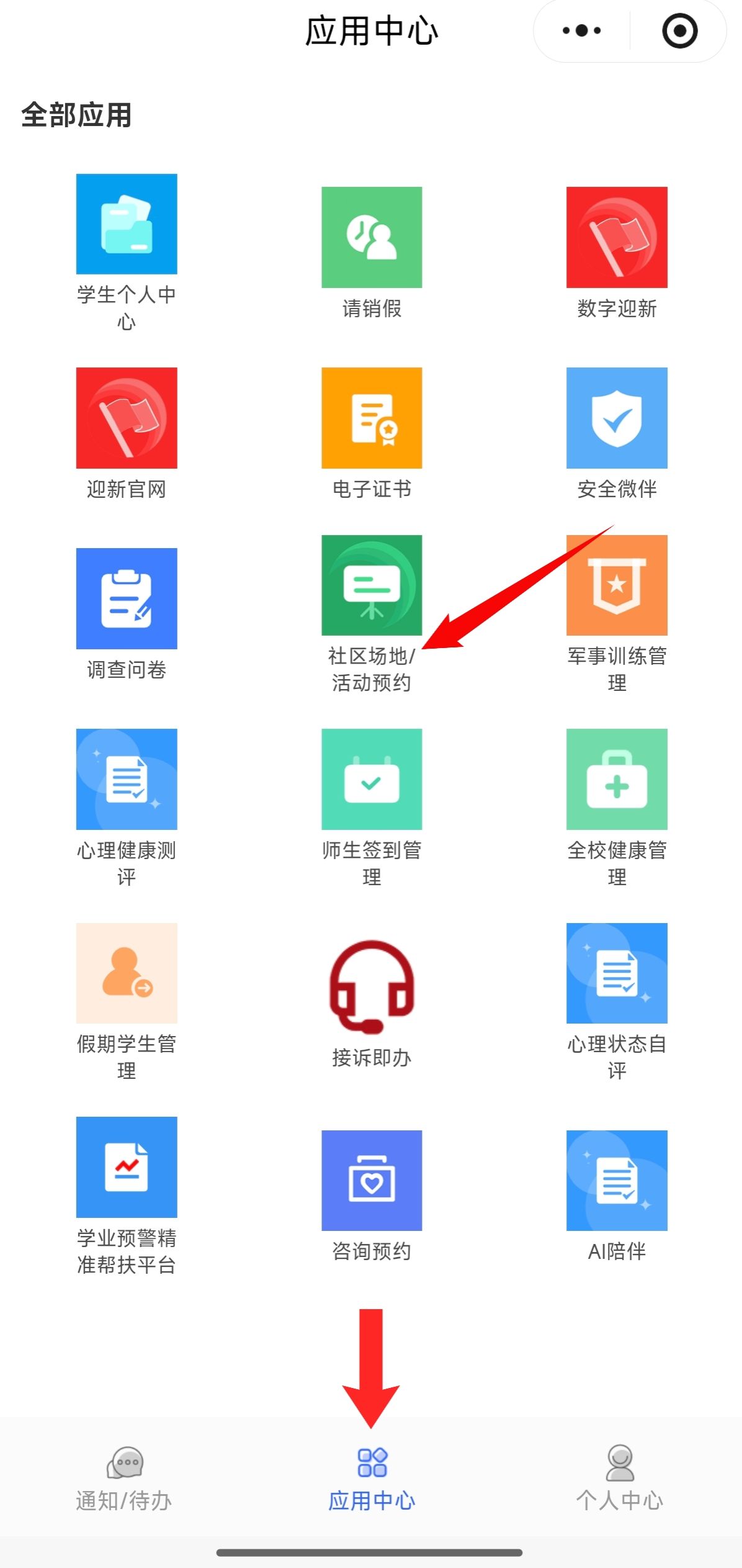 2.点击应用中心,进入“社区场地预约”。