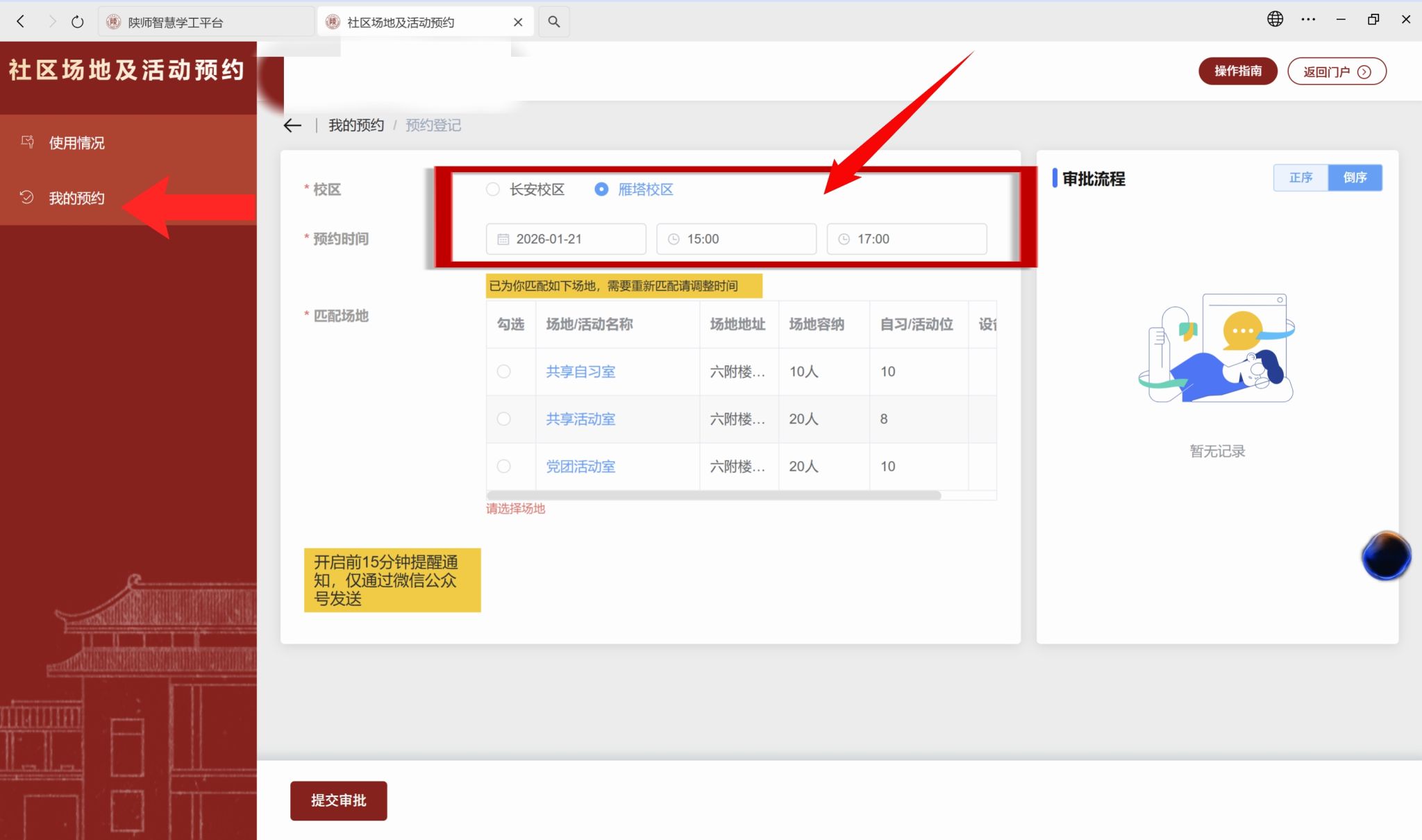 4.在“我的预约”中同样可以发起场地预约。输入要预约的校区和时间后,系统会为您匹配预约时段中可供自习的场地,点击“提交审批”直接预约即可预约成功,此流程免审批。