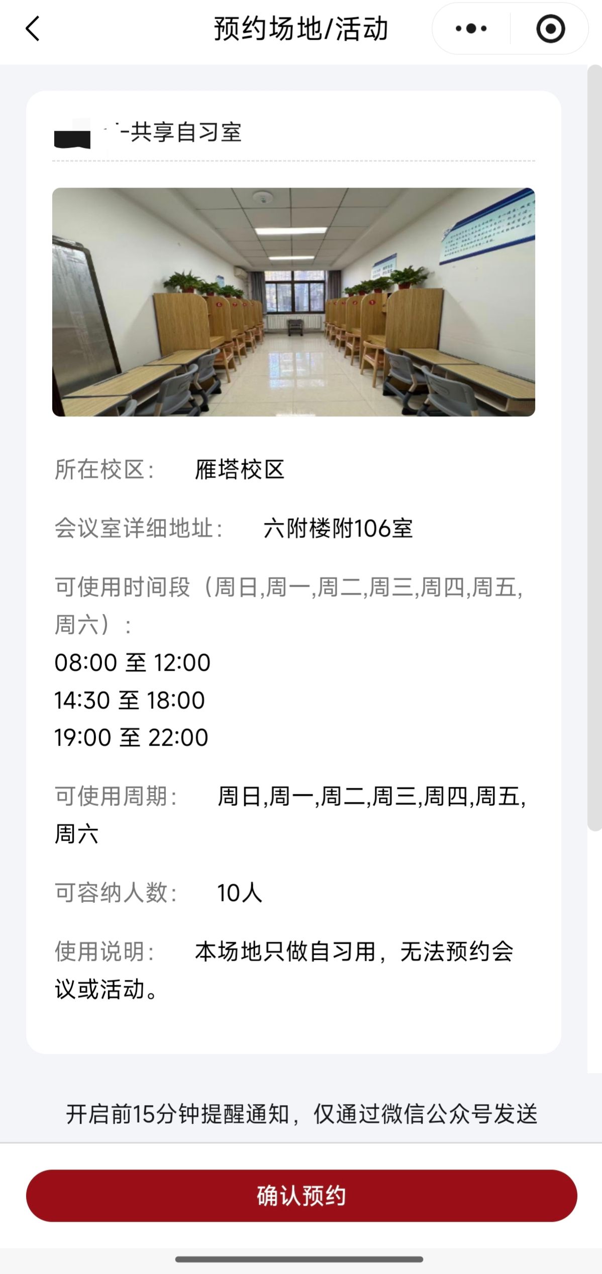 注意:预约成功通知会通过微信下发,一个时间段只能预约一个自习场地。