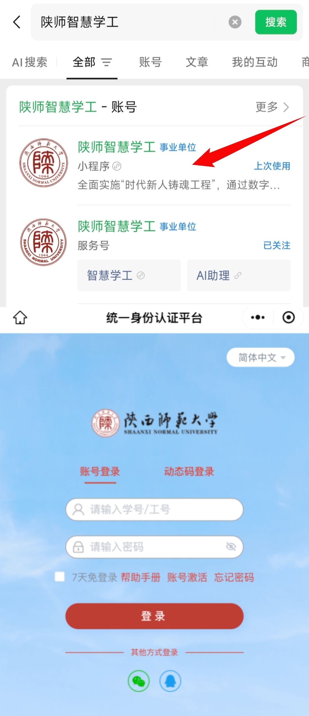 1.微信搜索“陕师智慧学工”小程序,点击并进入身份认证页面,使用学校统一身份认证账号密码登录。