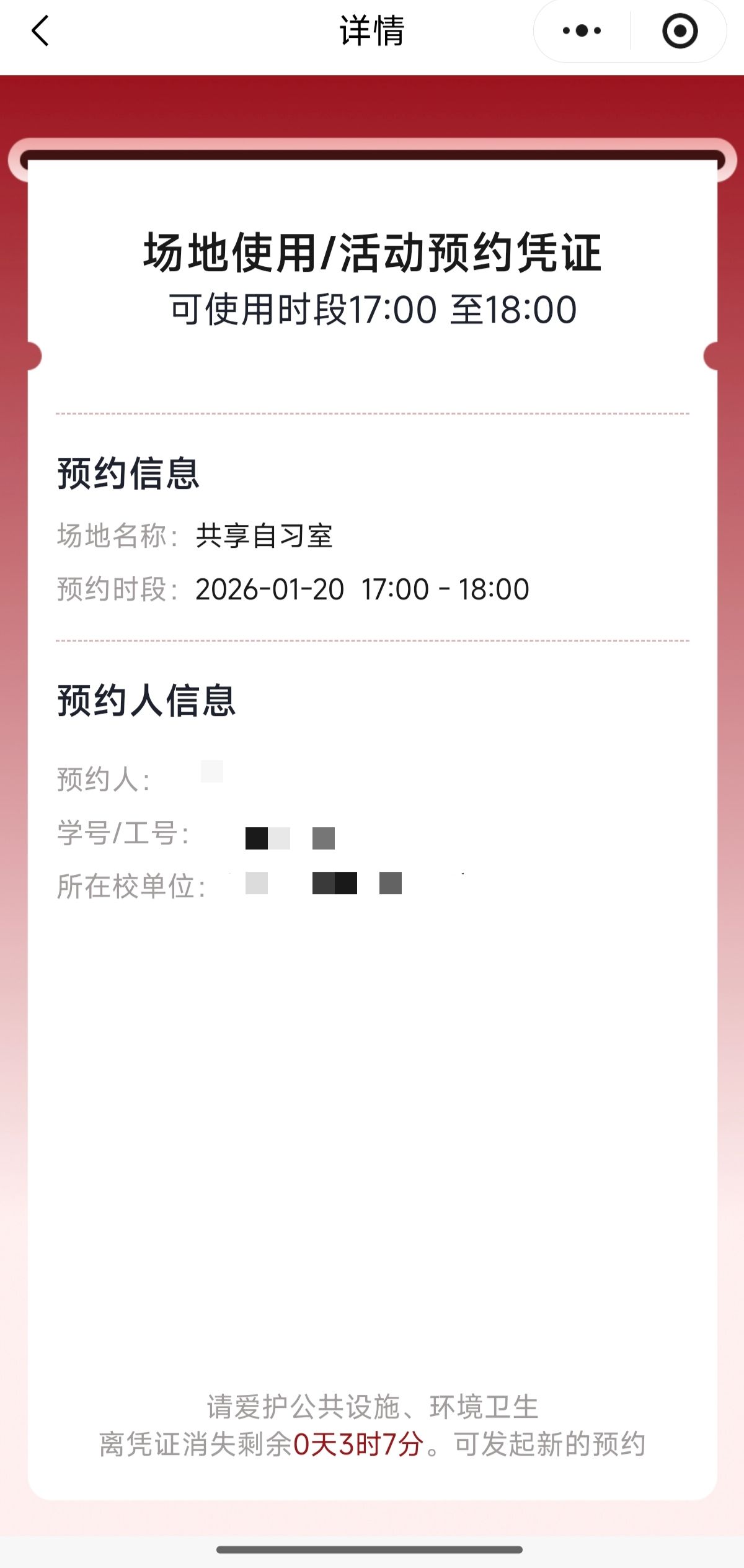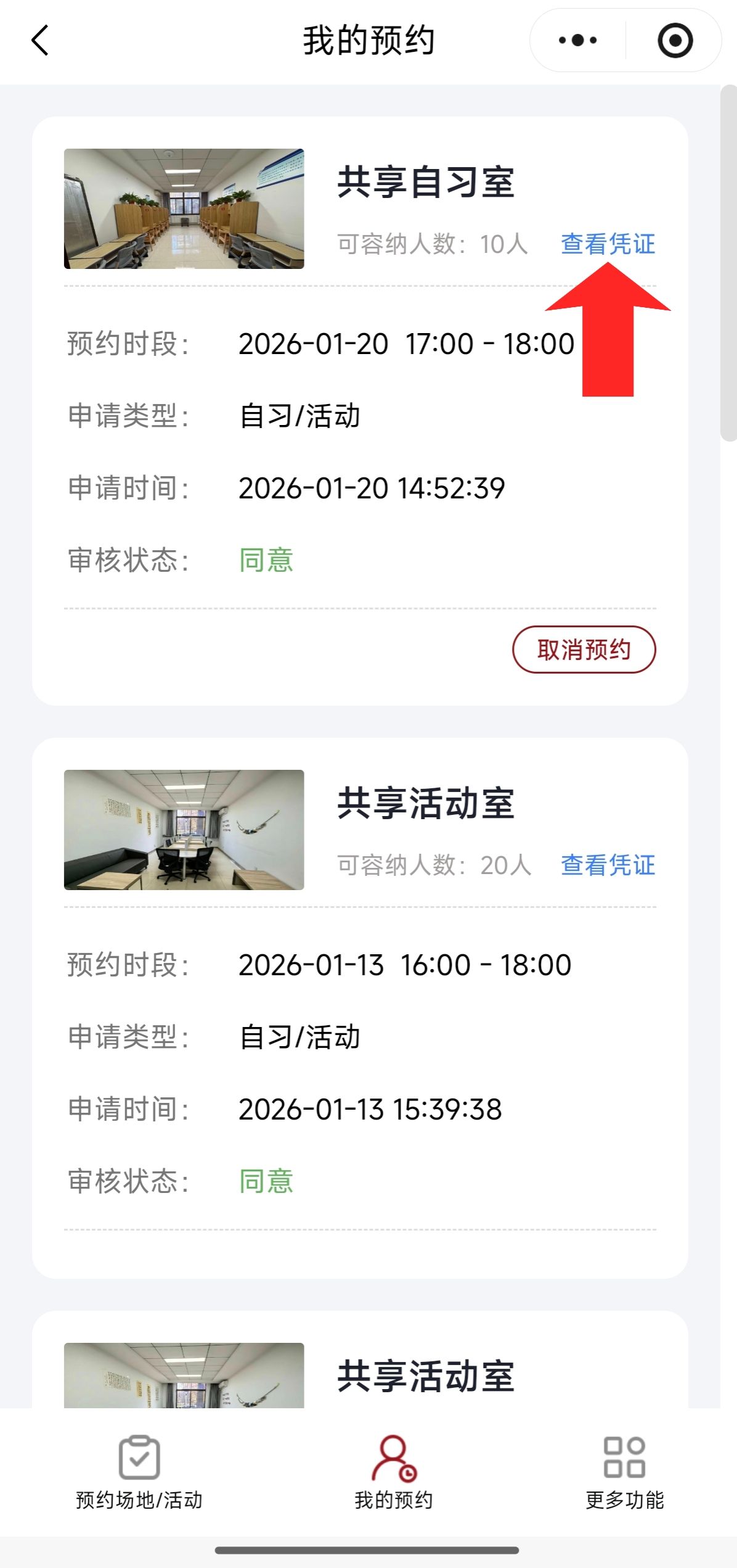 5.预约成功,可以主动“取消预约”。也可以查看预约凭证,场地使用完毕后凭证将自动消失。