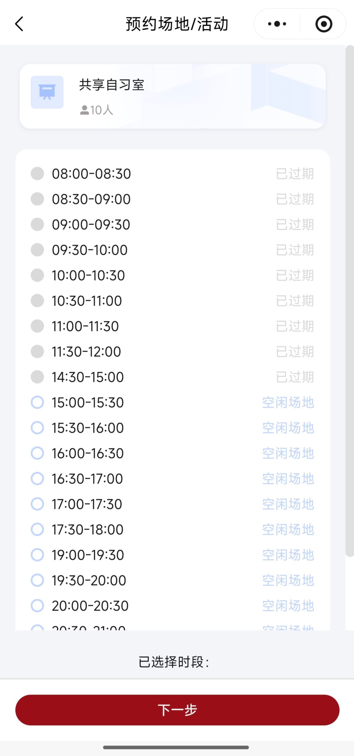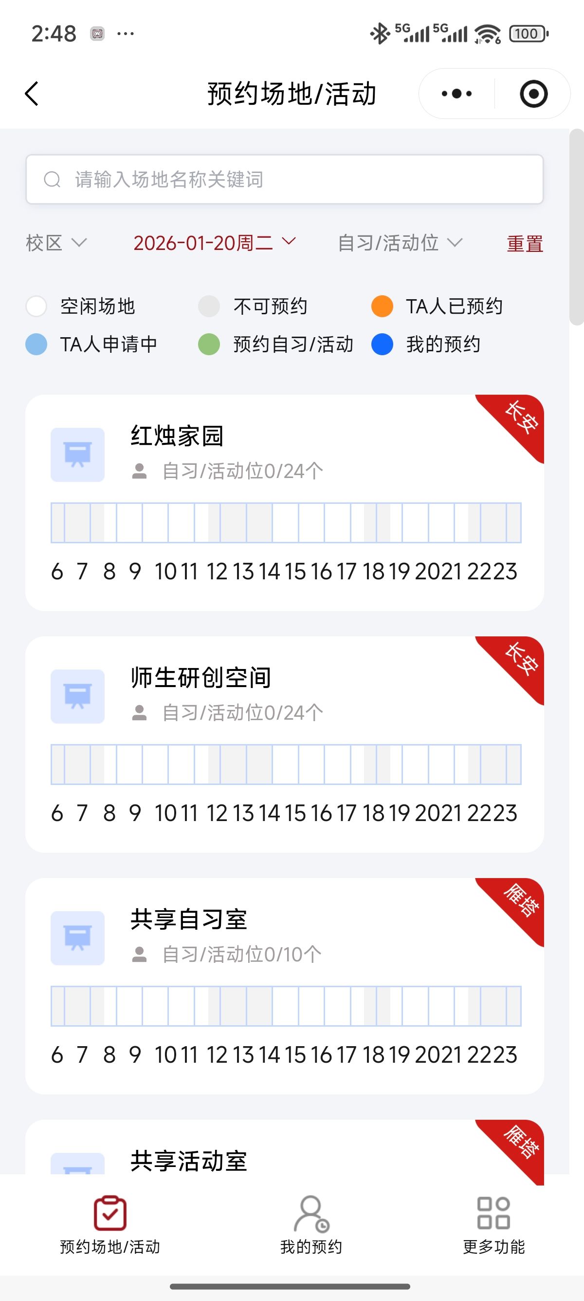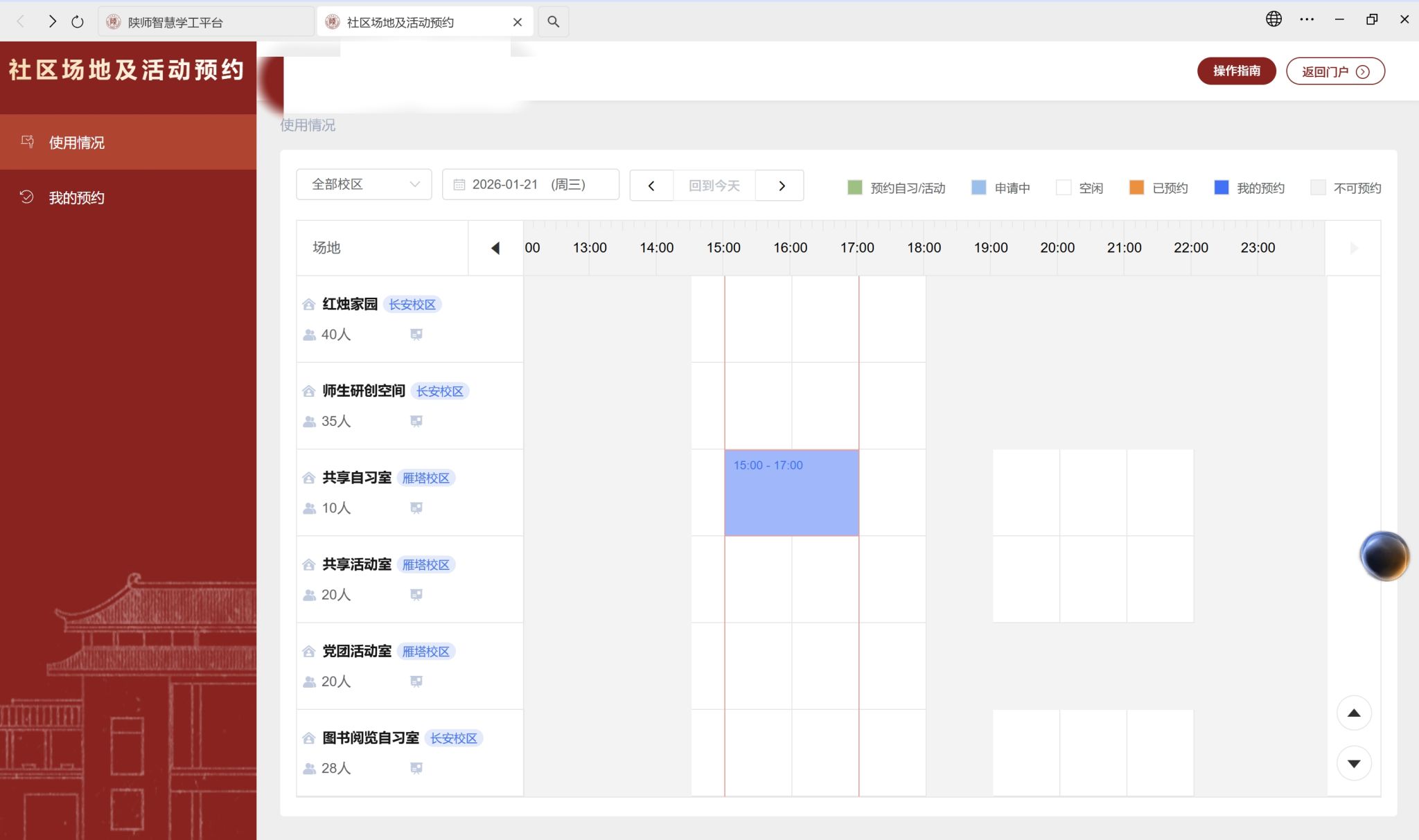 注意:学生只能预约场地进行自习,如若需要预约活动会议场地,请联系辅导员进行申请。(教师预约流程详见后文)