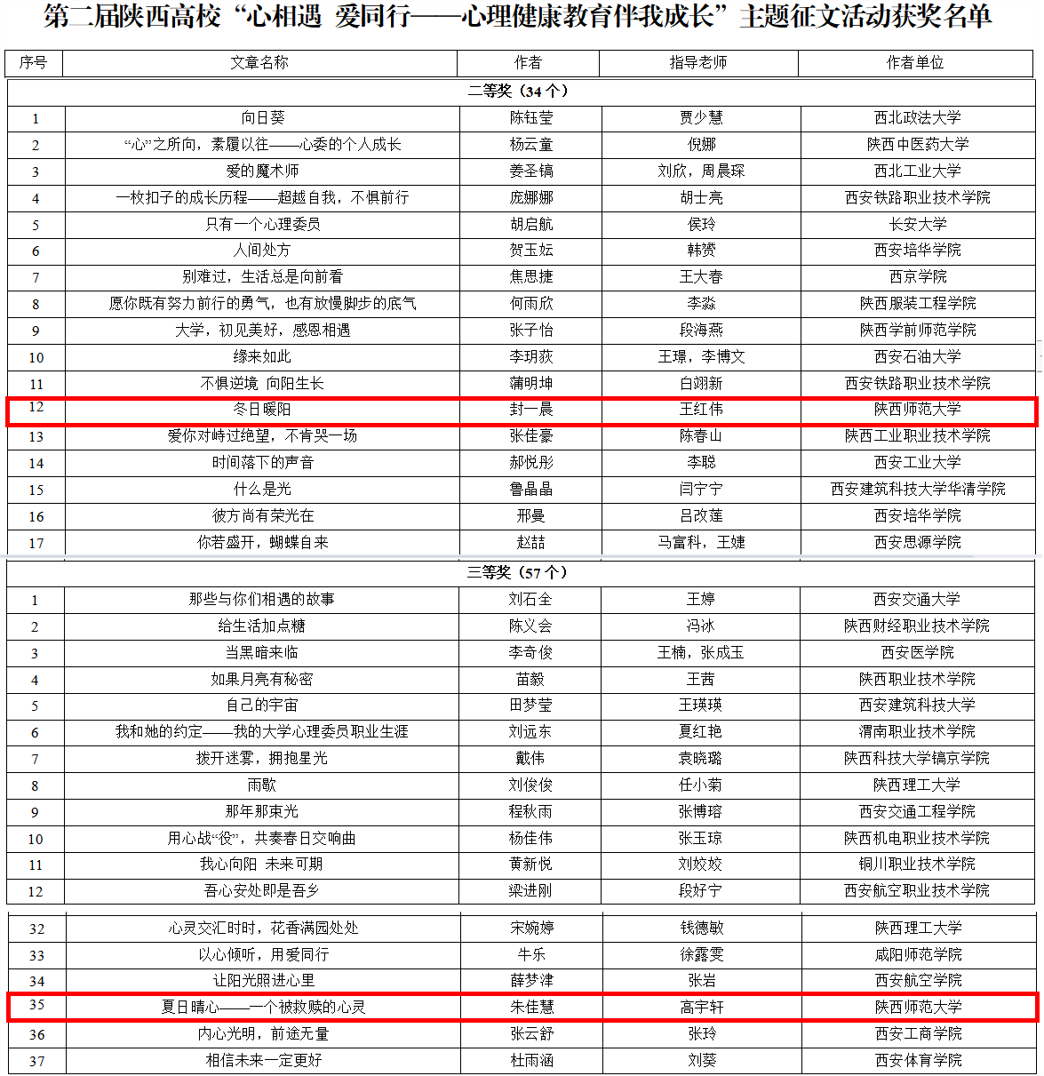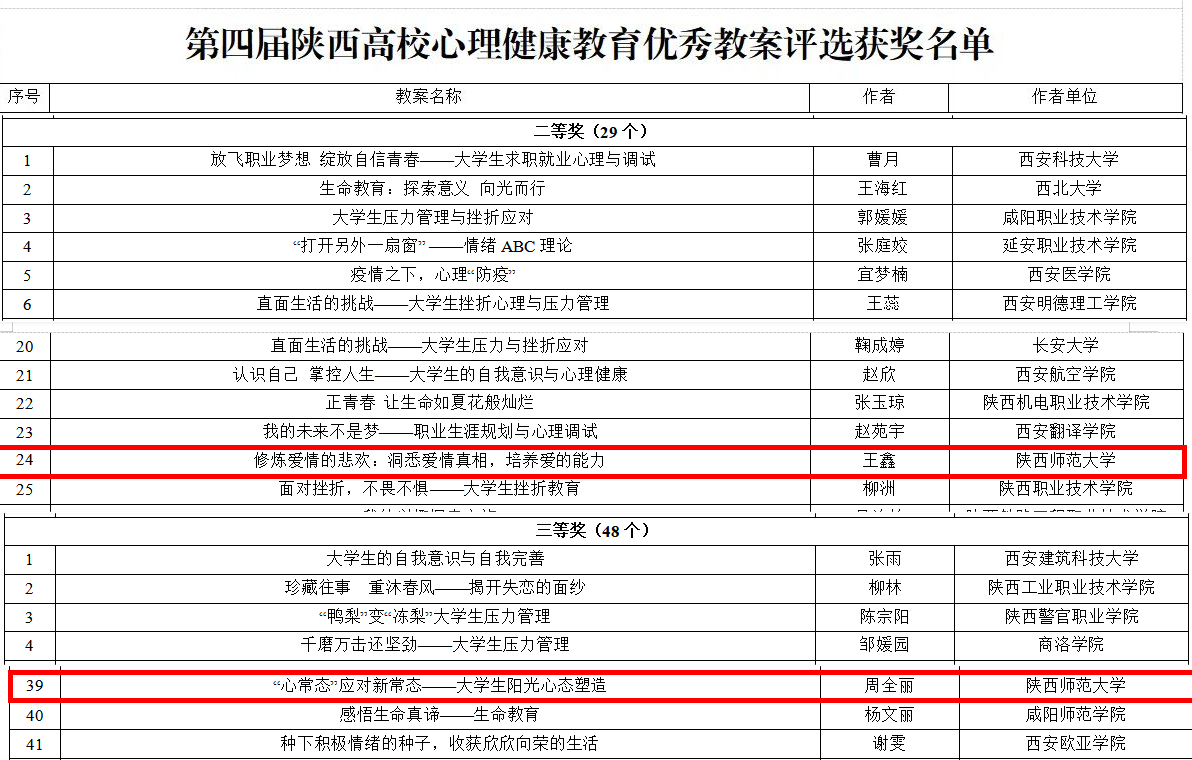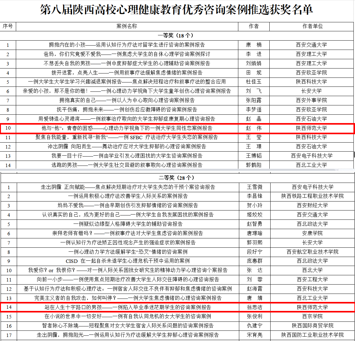 经校内评选、学校推荐、专家评审、工委研究、结果公示等程序,心理中心专职教师赵伟的参赛作品《他与“他”:青春的困惑——心理动力学视角下的一例大学生同性恋案例报告》、化学化工学院辅导员翁思洁的参赛作品《站在人生十字路口的男孩——一例陷入毕业季迷茫期学生的咨询案例报告》分别荣获第八届陕西高校心理健康教育优秀咨询案例一等奖和二等奖; 文学院辅导员王鑫的参赛作品《修炼爱情的悲欢:洞悉爱情真相,培养爱的能力》、心理中心专职教师周全丽的参赛作品《“心常态”应对新常态——大学生阳光心态塑造》分别荣获第四届陕西高校心理健康教育优秀教案二等奖和三等奖;物理学与信息技术学院封一晨同学的参赛作品《冬日暖阳》、外国语学院朱佳慧同学的参赛作品《夏日晴心—一个被救赎的心灵》分别荣获第二届陕西高校“心相遇爱同行——心理健康教育伴我成长”主题征文二等奖、三等奖,物理学与信息技术学院辅导员王红伟、外国语学院辅导员高宇轩获“优秀指导教师”称号。