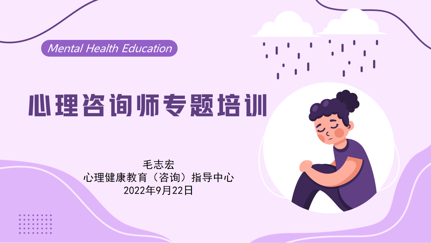 9月22日下午,心理健康教育(咨询)指导中心2022-2023学年秋季学期全体兼职心理咨询师岗前培训会在线上举行,培训由中心专职教师毛志宏副教授主讲,中心全体专兼职心理咨询师共计38人参加了此次会议。