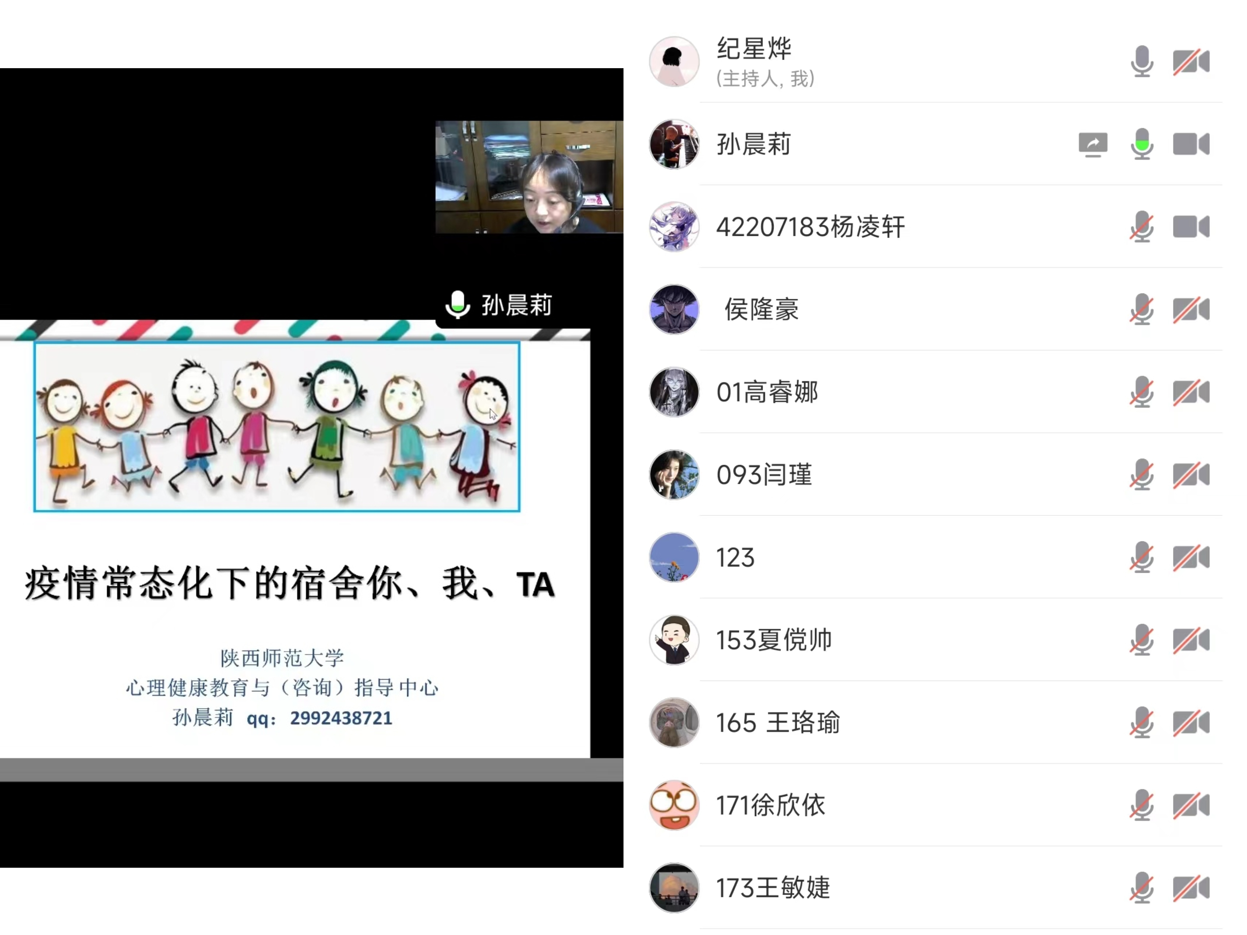 9月27日晚,“疫情常态化下的宿舍你、我、TA”专题讲座在线上举办,讲座由心理健康教育(咨询)指导中心专职教师孙晨莉主讲,共有298名学生参加。