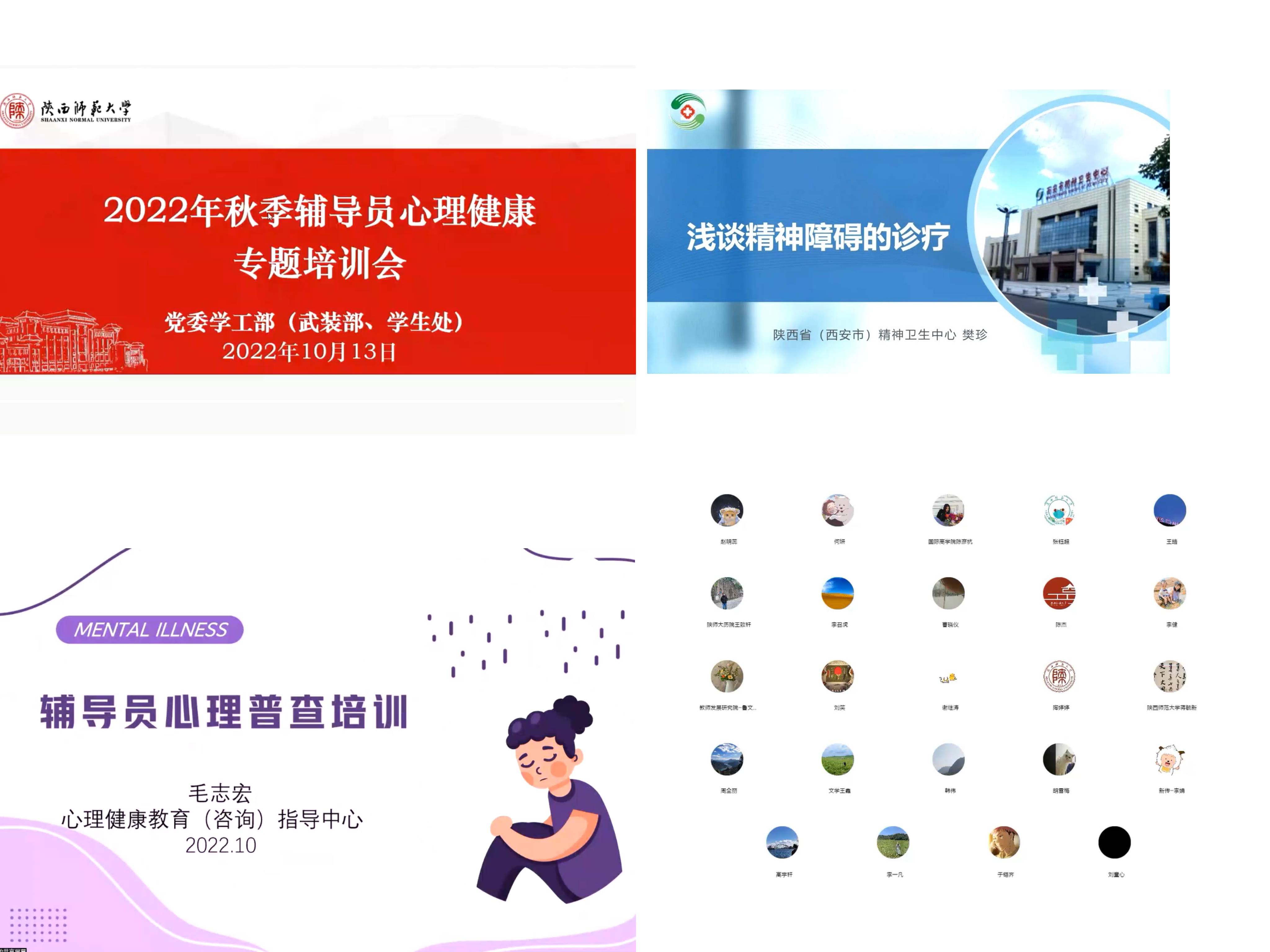 10月13日下午,有关心理健康测评量表解读及新生约谈培训会在线上举办。本次培训由西安市精神卫生中心心理科樊珍副主任医师和学校心理中心专职教师毛志宏副教授主讲,心理中心副主任周全丽主持,全体专兼职辅导员及专兼职咨询师参加了本次培训。