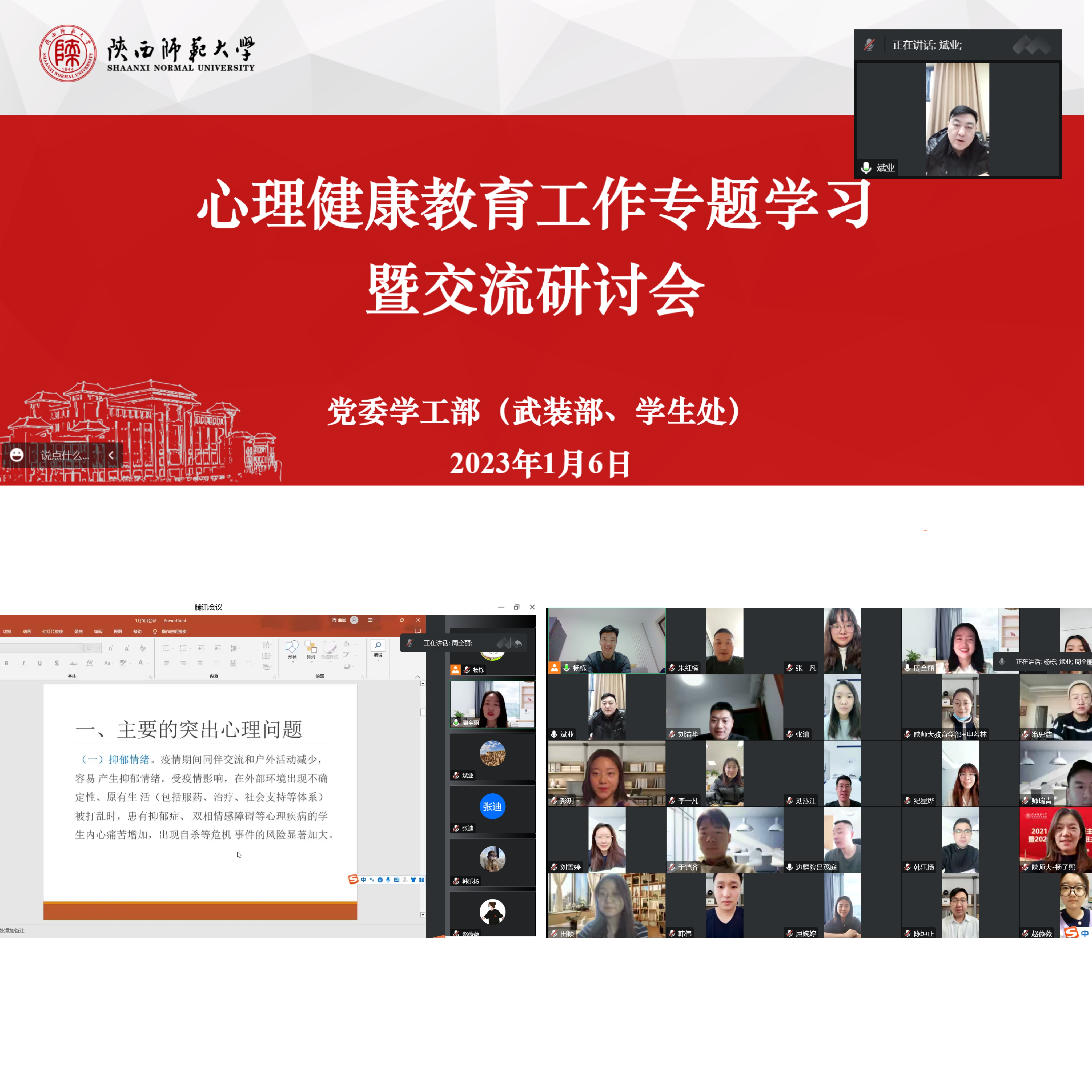 1月6日上午,心理健康教育工作专题学习暨交流研讨会在线上举办,党委学工部(武装部、学生处)部(处)长蒋毓新,副部(处)长兼心理中心主任祁斌业,心理中心全体专职教师和各培养单位心理专干共39人参加了会议。