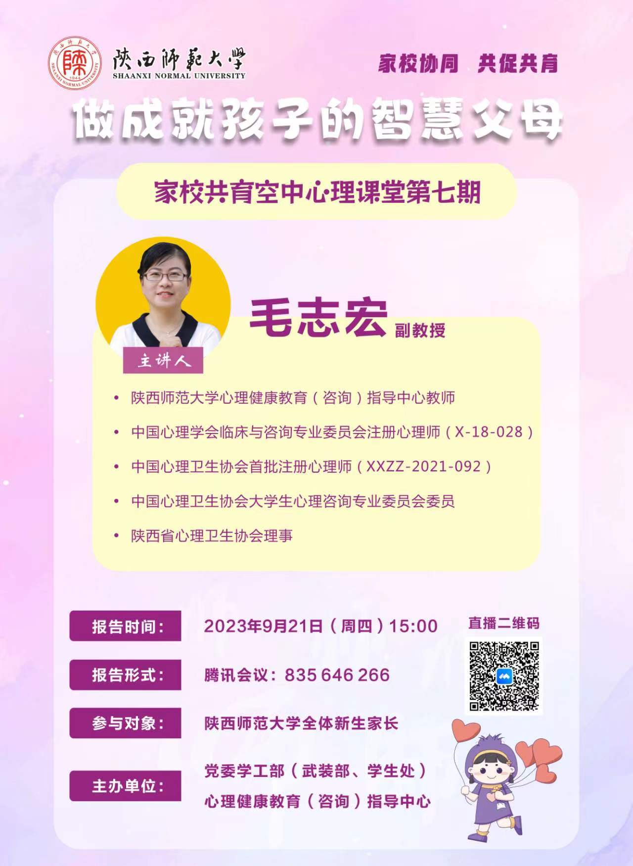 9月21日下午,“家校共育空中心理课堂”第七期——2023级新生家长专题报告在线上举办。报告由学校心理健康教育(咨询)指导中心专职教师毛志宏主讲,我校2023级新生家长及心理中心专兼职咨询师进行了观看学习。