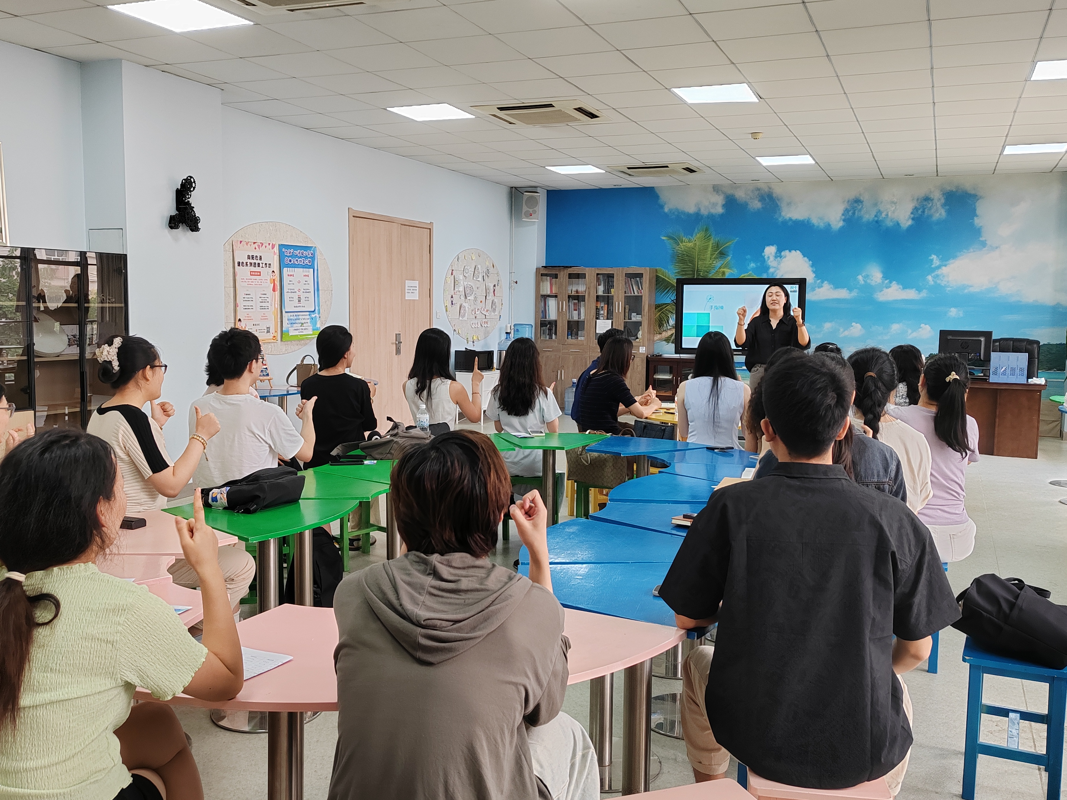 培训会上,教育部24365“互联网+就业指导”直播课分享嘉宾、陕西省高校就业创业专家库成员韩赟副教授面向心理专干及兼职咨询师开展了以职业生涯发展为主题的心理团体辅导培训。现场气氛热烈,大家在培训中体验学习,取得了良好效果。