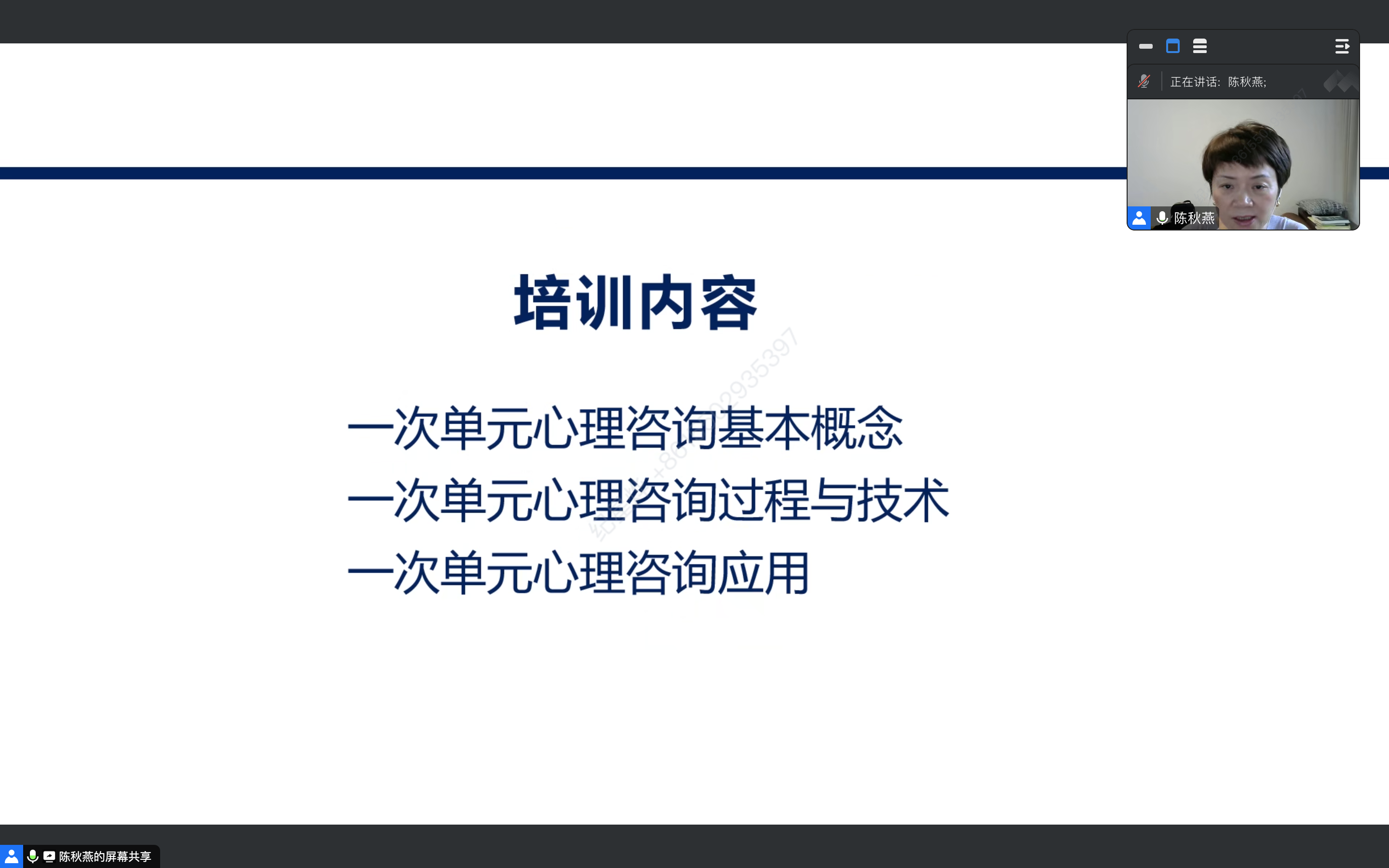 陈秋燕在培训中介绍了一次单元心理咨询(Single-Session Therapy, SST)的核心理念、咨询过程、技术方法和实际应用,并详细阐释了一次单元心理咨询五个阶段(建立关系、了解问题、解决问题、心理教育和总结咨询)以及各个阶段对于来访者的治疗意义。