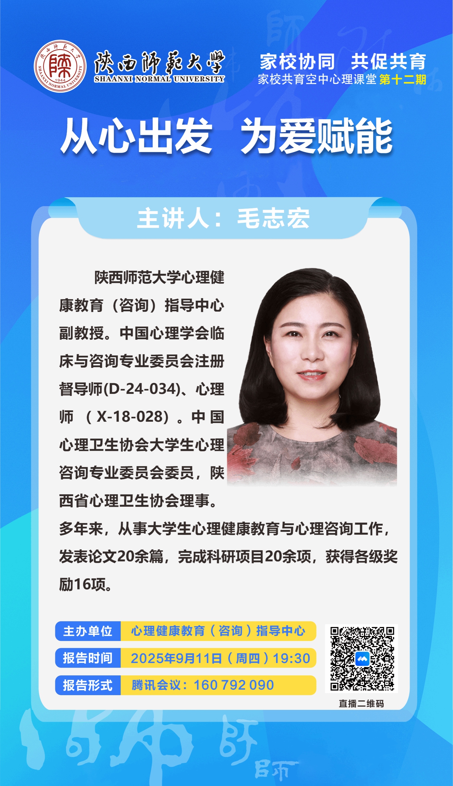 9月10日,“家校共育空中心理课堂”第十二期专题讲座在线上举办。本次讲座聚焦物理学院2023级学生成长中的心理困惑,由心理健康教育(咨询)指导中心专职教师毛志宏副教授主讲。物理学院2023级家长、辅导员、全校心理专干及心理中心专兼职教师参加了此次讲座。