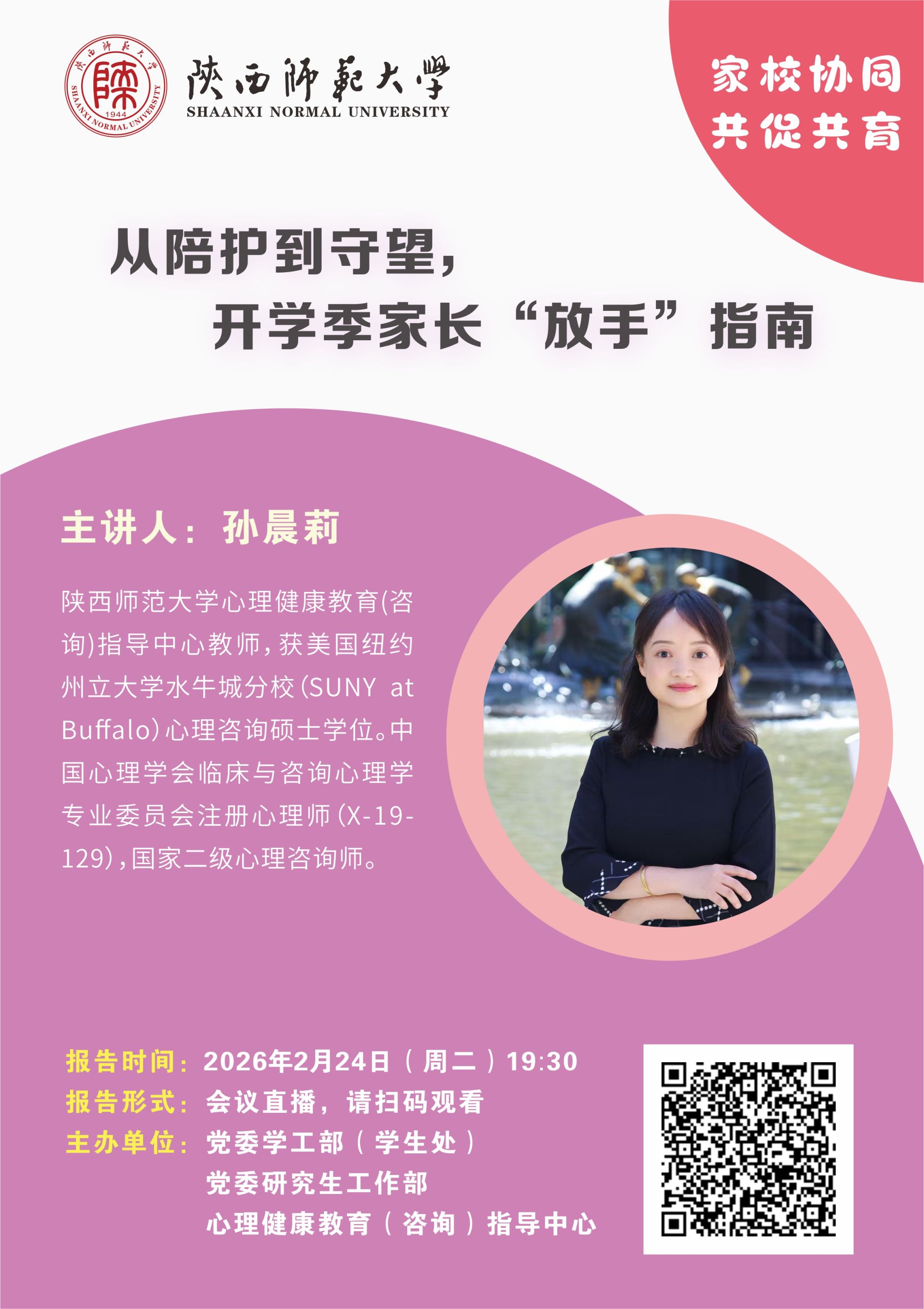 2月24日,“家校共育空中心理课堂”专题讲座在线上举办,本次讲座聚焦开学季亲子相处模式转换问题,由学校心理健康教育(咨询)指导中心专职教师孙晨莉主讲,我校学生家长及心理中心专兼职咨询师参加了讲座。