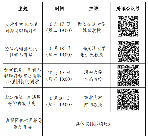 1.2023级本科生心理委员、宿舍健康联络员;2023级研究生朋辈心理互助员须线下集中组织学习,并做好考勤记录,严格规范要求。其他年级心理委员、宿舍健康联络员、朋辈心理互助员及相关学生干部鼓励积极参加。