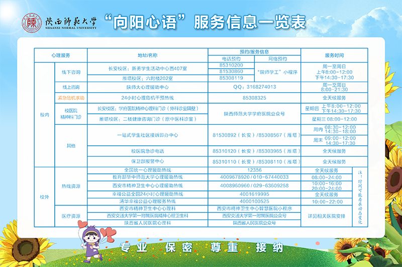 陕西师范大学历来高度重视学生心理健康教育工作,始终将心理健康教育作为落实立德树人根本任务的重要环节,心理育人工作自上世纪八十年代起步,历经数十年探索建设,现已形成体系完备、专业引领、资源充沛的良性发展格局。学校心理健康教育(咨询)指导中心正式成立于2002年5月,2007年正式被陕西省委高教工委设为“陕西大学生心理健康教育培训基地”,2015年成功获评“陕西普通高等学校心理健康教育与咨询示范中心”称号,2021年荣获“...